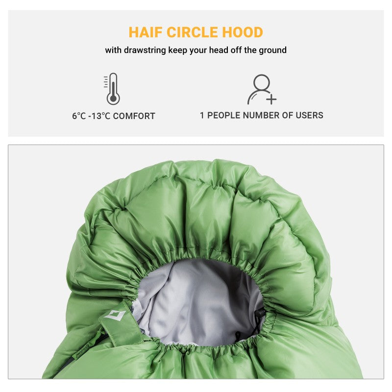 - 【Advanced Design】250g/m2 insulation is designed for better heat retention with less weight. Neck-collar, zipper wind-baffle, adjustable drawstring hood, and other detailed designs provide better insulation for this sleeping bag.