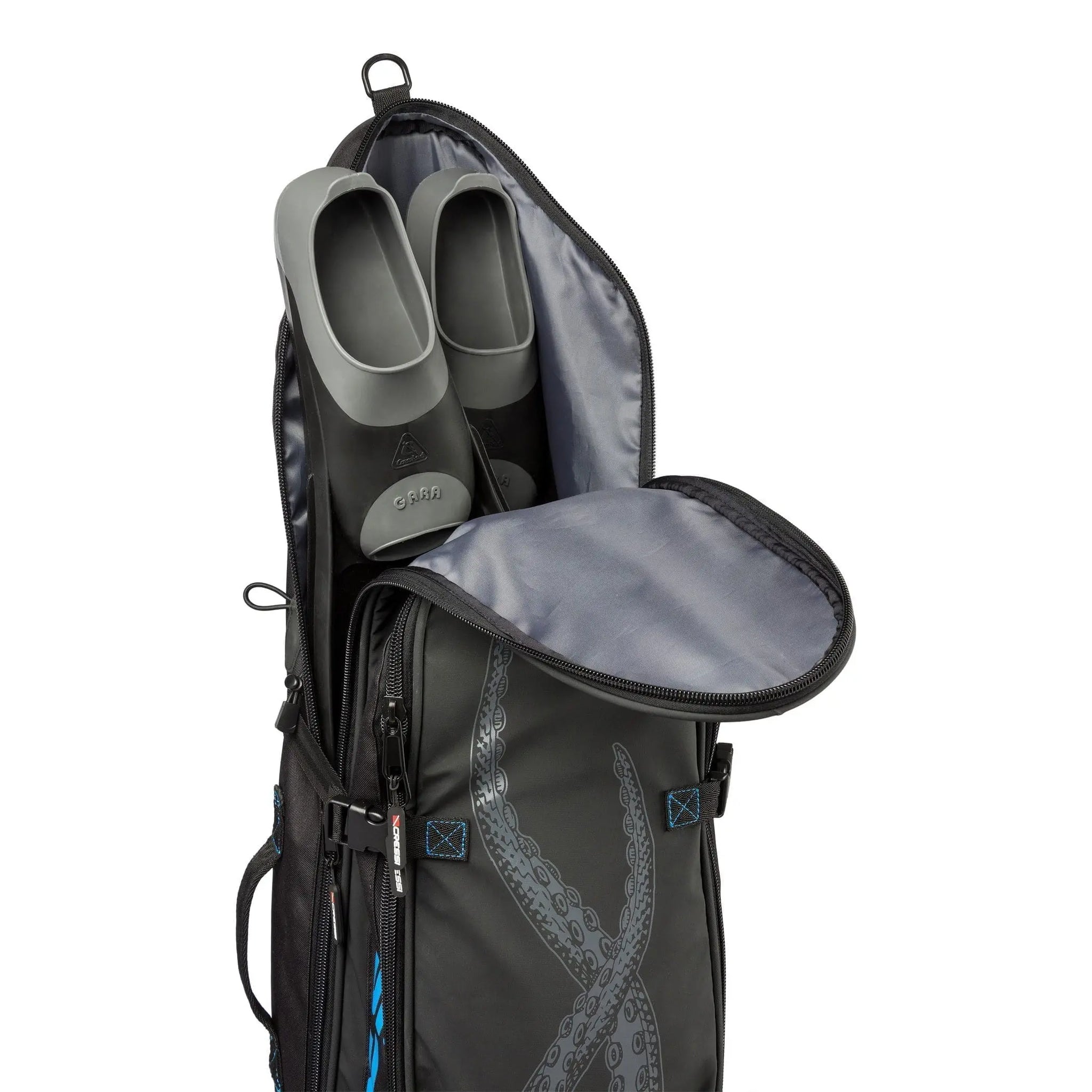 The main compartment, with breathable anti-moisture mesh at the bottom, can accommodate freediving fishing gear, such as wetsuit, long fins (up to 100 cm / 39.37 in), mask, mouthpiece, belt, knife and various accessories. The secondary compartment, i.e. the outside pocket, is as a “cool” type refrigerator bag for the transport of cold drinks or fish.