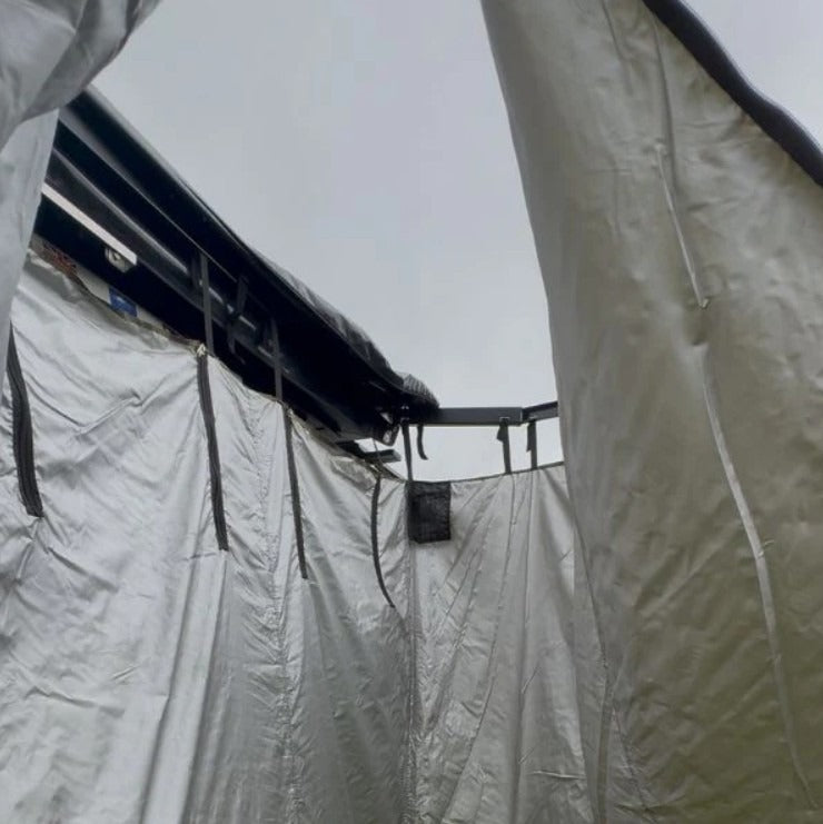 Crafted from high-grade 3mm-thick aluminum and finished with a sleek black powder coating, the QUICK PITCH Quick-en-Suite Maxx is built to withstand natural elements while maintaining a stylish look. It’s engineered for convenience, featuring gas struts on both arms, making pitching a breeze. The struts ensure the arms open easily and remain steady even in windy conditions, so you can enjoy a stable, hassle-free setup wherever you are. Inside, the Quick-en-Suite Maxx is designed for optimal practicality. It includes two ventilated interior bags, perfect for storing soaps, accessories, or other essentials. Two interior windows provide easy access to your canopy or vehicle to grab what you need without leaving the cubicle. Whether you’re camping, overlanding, or exploring an off-the-beaten-path, the Quick-en-SuitMaxx shower cubicle offers the ultimate blend of functionality, durability, and simplicity.