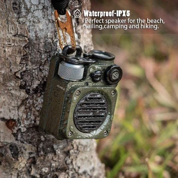 The Wild Mini Outdoor speaker is rugged durability, Wireless Bluetooth speaker with built-in 800mAh lithium battery for up to 8 hours of playtime at 2/3 volume on a full charge; designed to be comfortable to carry with no square edges, so much better for travel & hiking, superlight and easy to fit in or attach to your bag or backpack