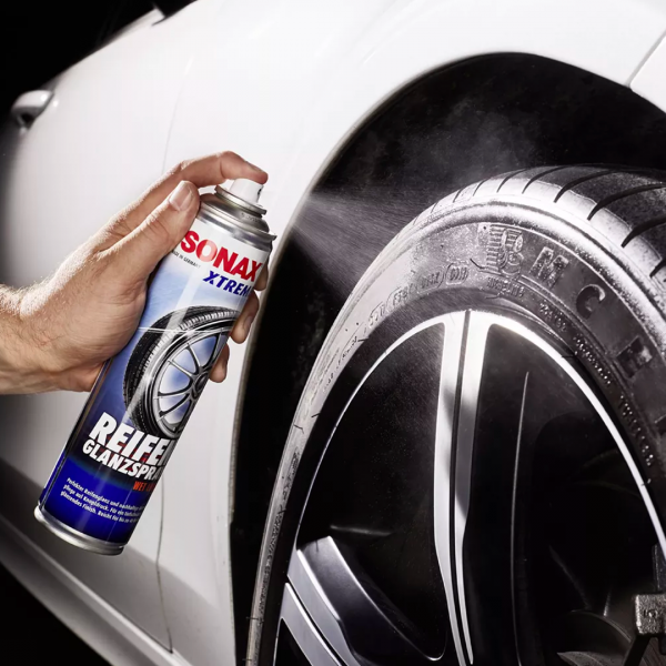 SONAX XTREME Tyre Gloss Spray for a long lasting, rich, deep shine and that wet look for the tyres. The rubber is simultaneously maintained and, with regular application, protected against cracking, premature aging, brown discolouration and colour bleaching. The deep black and shiny appearance will last for several weeks.