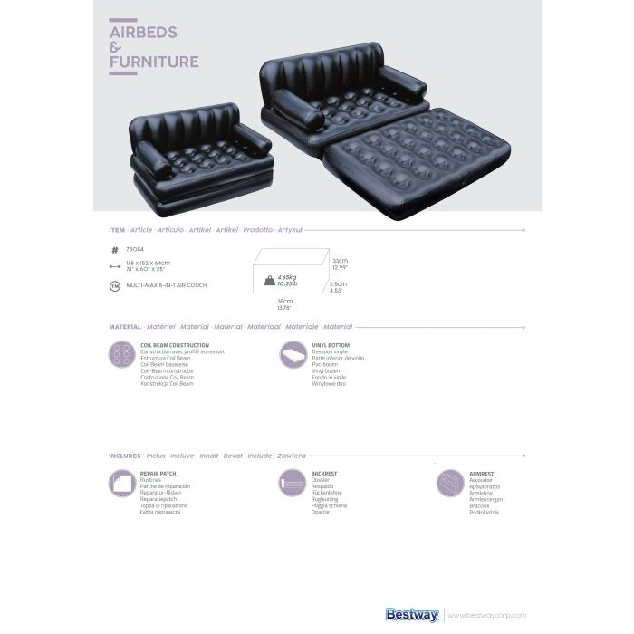Bestway 74" X 60" X 25"/1.88M X 1.52M X 64CM Multi-Max 5-IN-1 Air Couch (Contents:couch, repair patch)