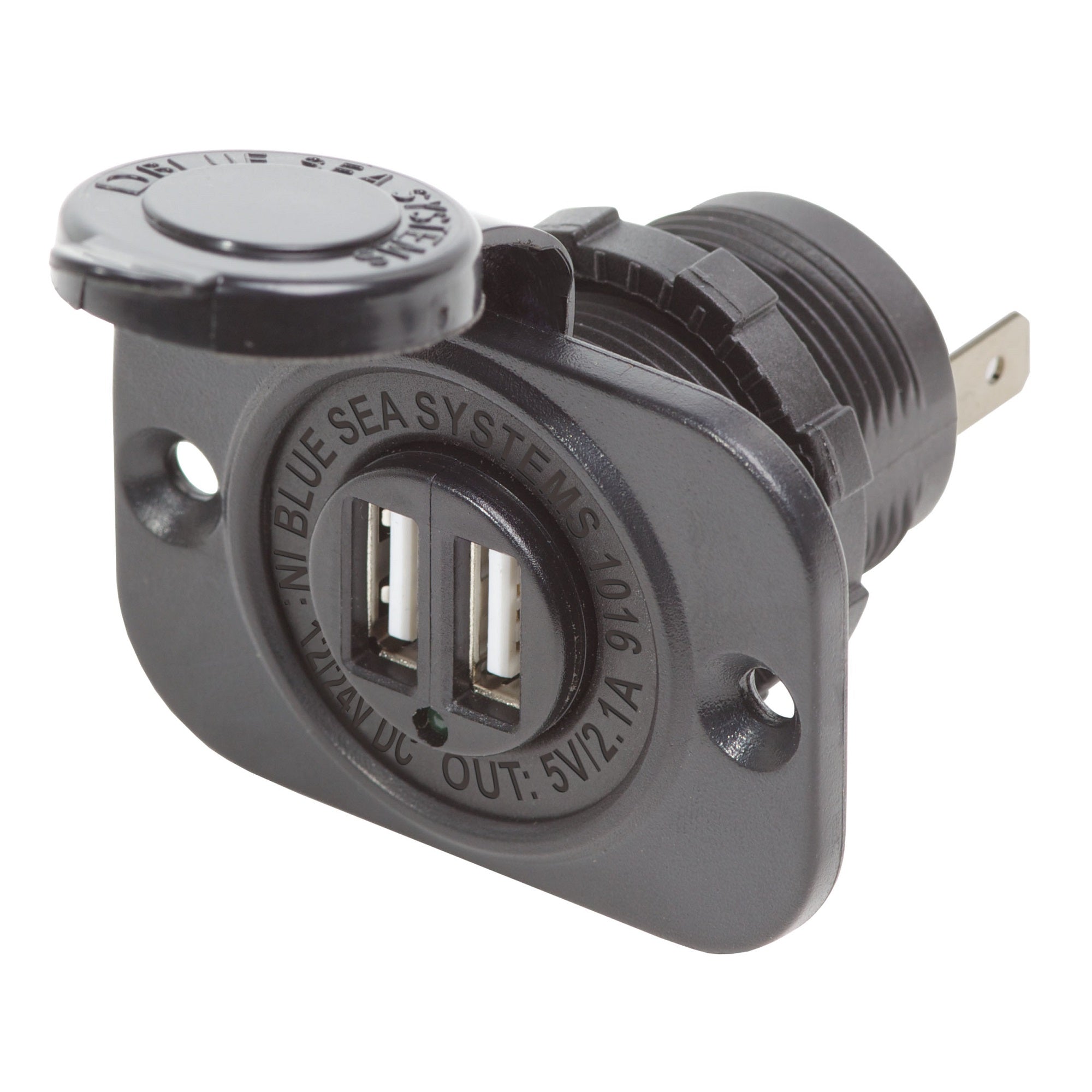 Protective dust cap with tether keeps dust and spray from shortening the life of the charger.