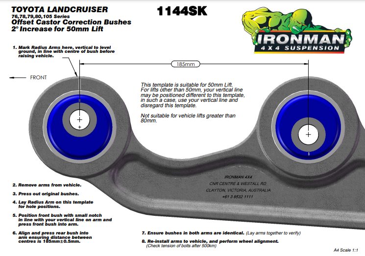 Ironman 4×4 Rubber Caster Correction bushings will remedy this condition, featuring a 2 degree offset made from durable rubber construction for higher flexibility compared to polyurethane alternatives.