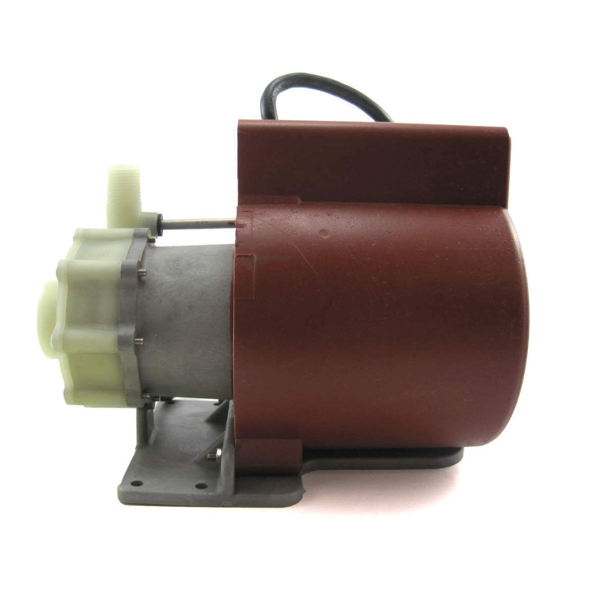 March Pump's industrial LC-5C-MD is an American submersible seal-less centrifugal magnetic drive pump. It is capable of generating a maximum flow of 15 gallons per minute at 2 feet, and its maximum head is 27 Feet (or around 11PSI). The LC-5C-MD pump may be used submerged or not submerged. The standard wet end (the materials that come into contact with the solution) is composed of Polypropylene, Buna N, Stainless Steel, Ceramic, and Ceramic Magnet. When submerged, Epoxy, Noryl, and the Cord are also in contact with the solution. The inlet connection is 1 inch female pipe thread, and the outlet is 1/2 inch male pipe thread. The standard motor is a 1 Phase 230V 0.125 Horsepower motor, which can be run on either 50 or 60 hertz (there are performance differences between the hertz options). The maximum internal pressure the pump can tolerate is 25 PSI, and the maximum liquid temperature is 130 Fahrenheit or 54 Celsius. The March LC-5C-MD centrifugal magnetic drive pump is capable of handling fresh water, salt water, and mild chemicals.