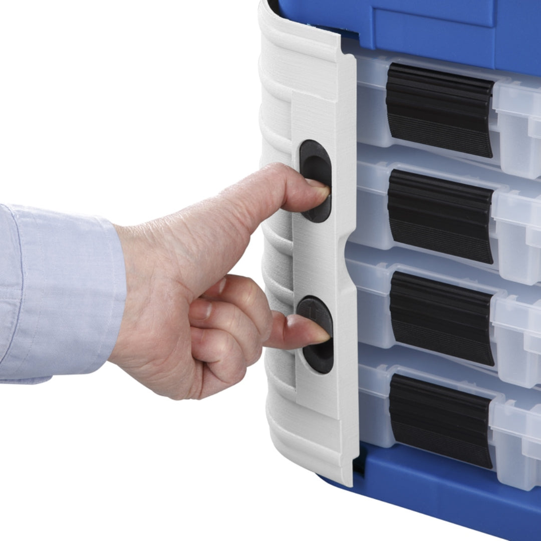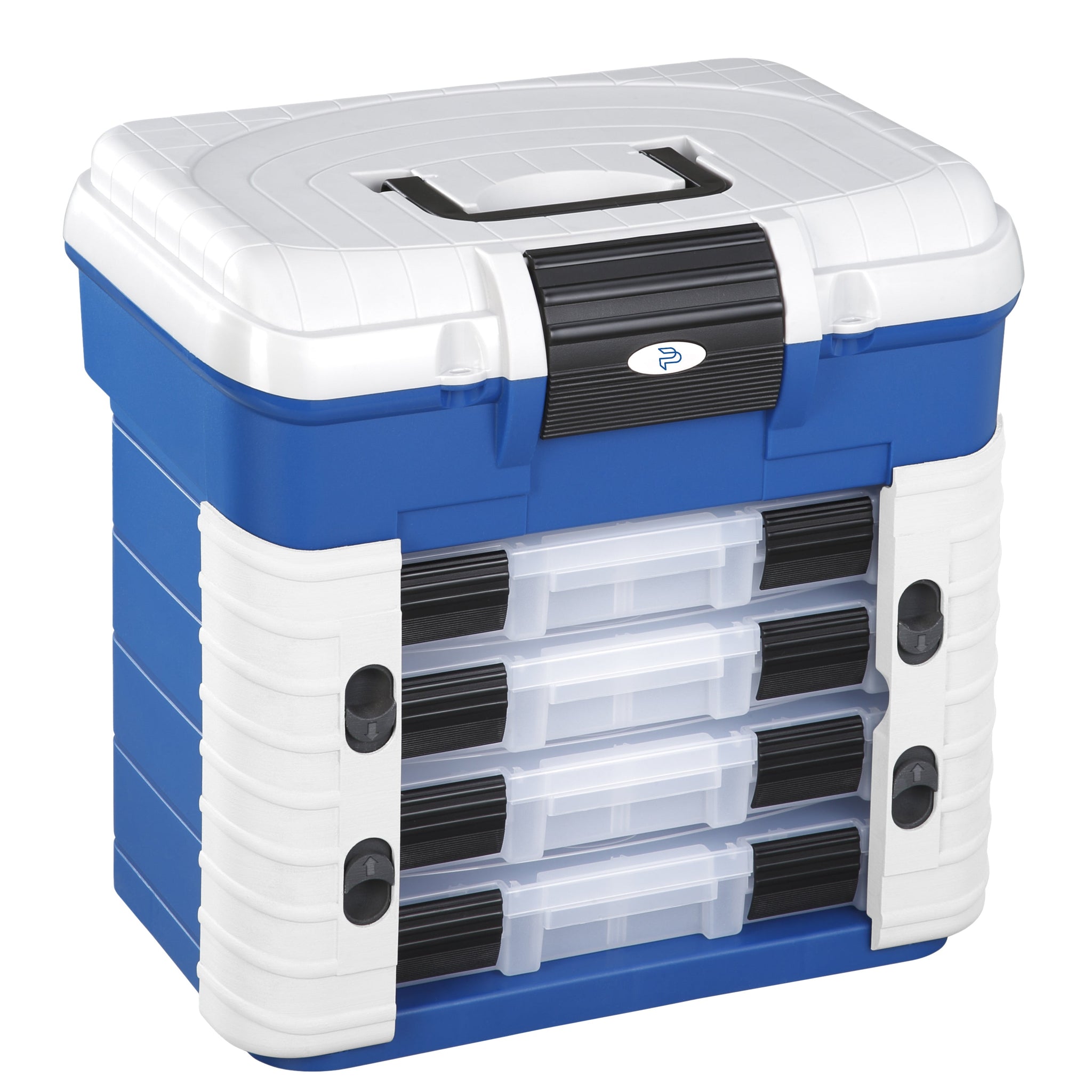It features a double-hook locking system for convenient and secure closing, and includes 1 artificial bait box  and 4 boxes with movable dividers.