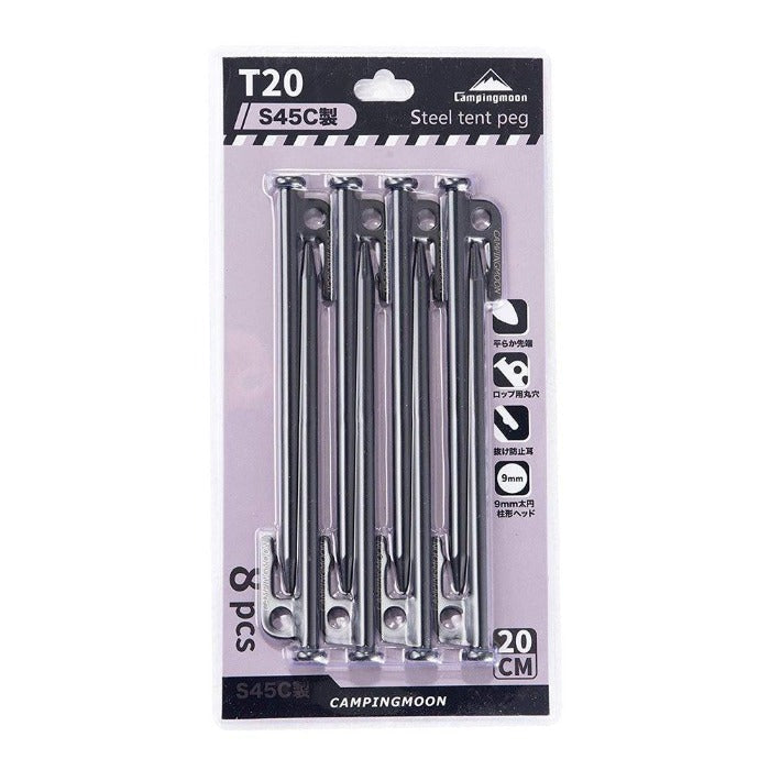Introducing the Camping Moon T-Series Steel Pegs, a highly sought-after product in international markets. These pegs are crafted from carbon steel S45C, renowned for its robustness in machine structures. Their exceptional hardness, measuring 200Hb or more, sets them apart from the majority of steel products available, which are typically S35C castings with a hardness of about 120Hb. These pegs excel in driving into hard ground and offer exceptional durability, making them ideal for various terrains, including gravel and tough, solid ground.