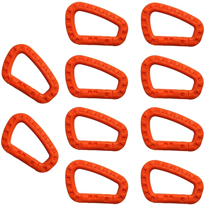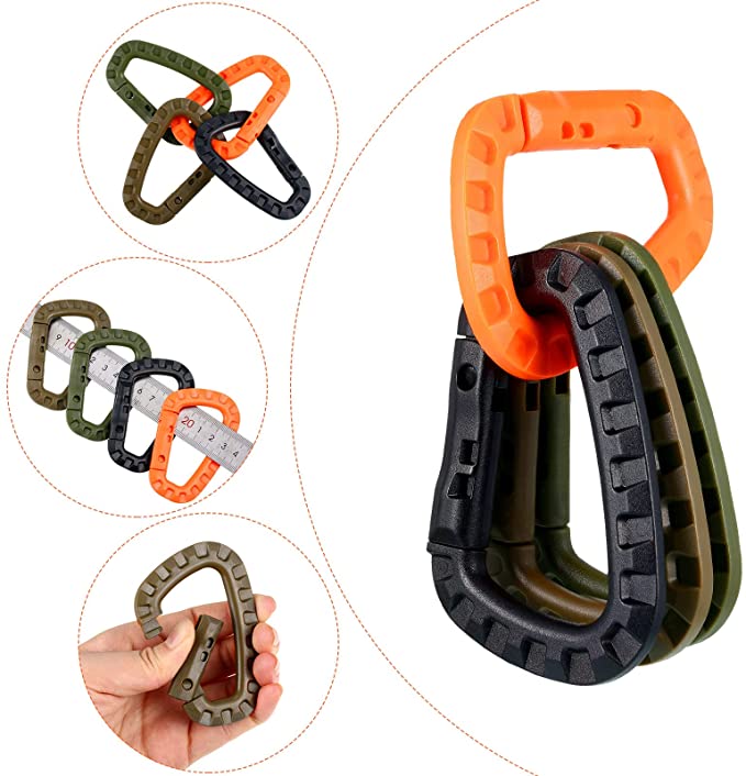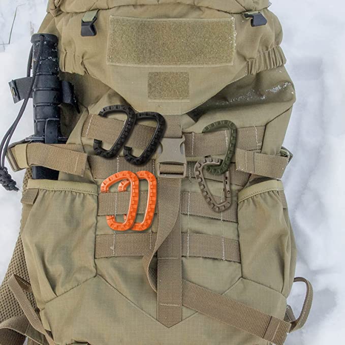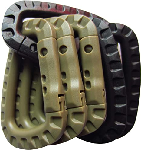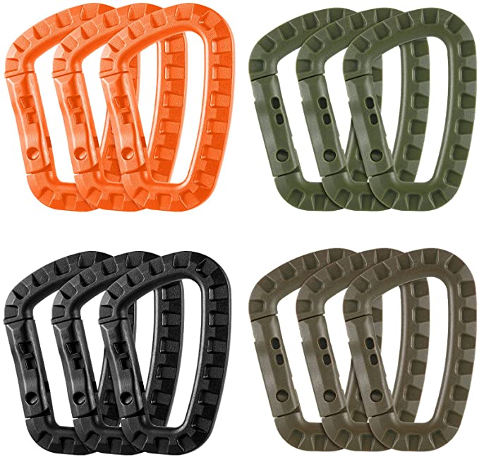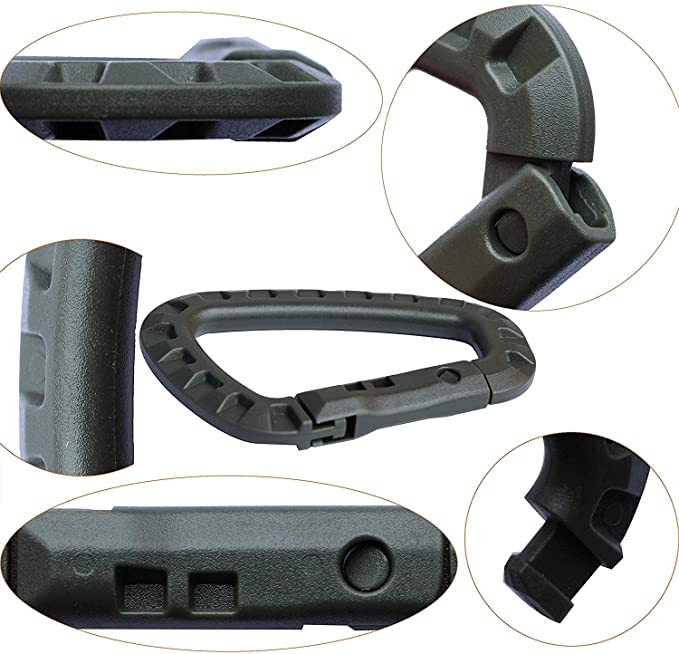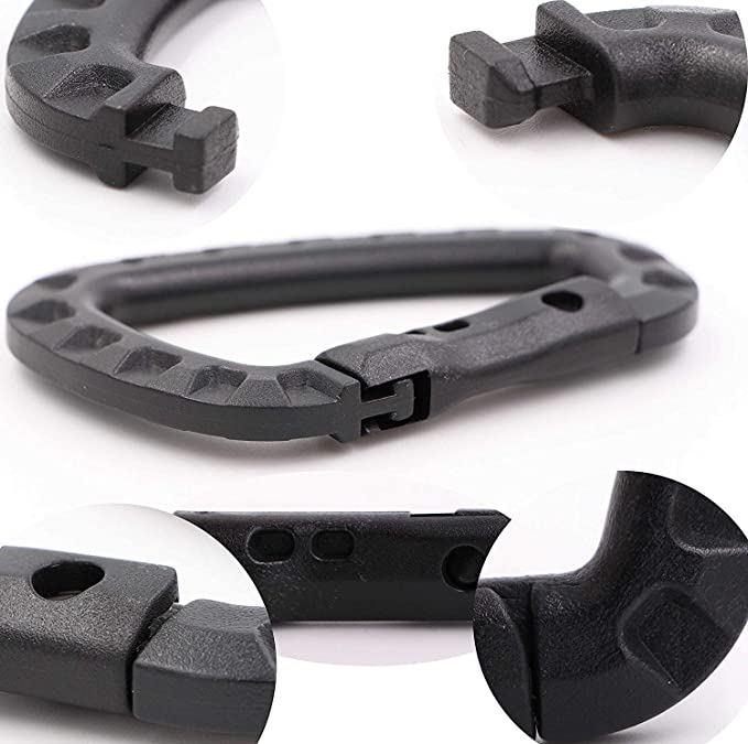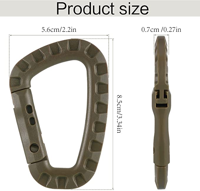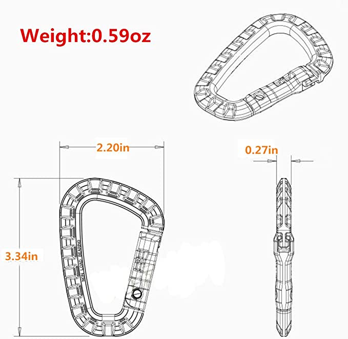 - Size:Carabiner climbing rings outer size:3.35inch x 2.2inch (8.5x5.6cm);inner size: 2.36 inch x 1.3inch (6x3.3cm); tactical gear clip color: black; Package includes: 10 PCS carabiner D-ring clips.
