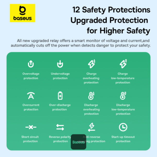 - 12 Safety Protections: Overcurrent, reverse polarity, overcharge, and more.