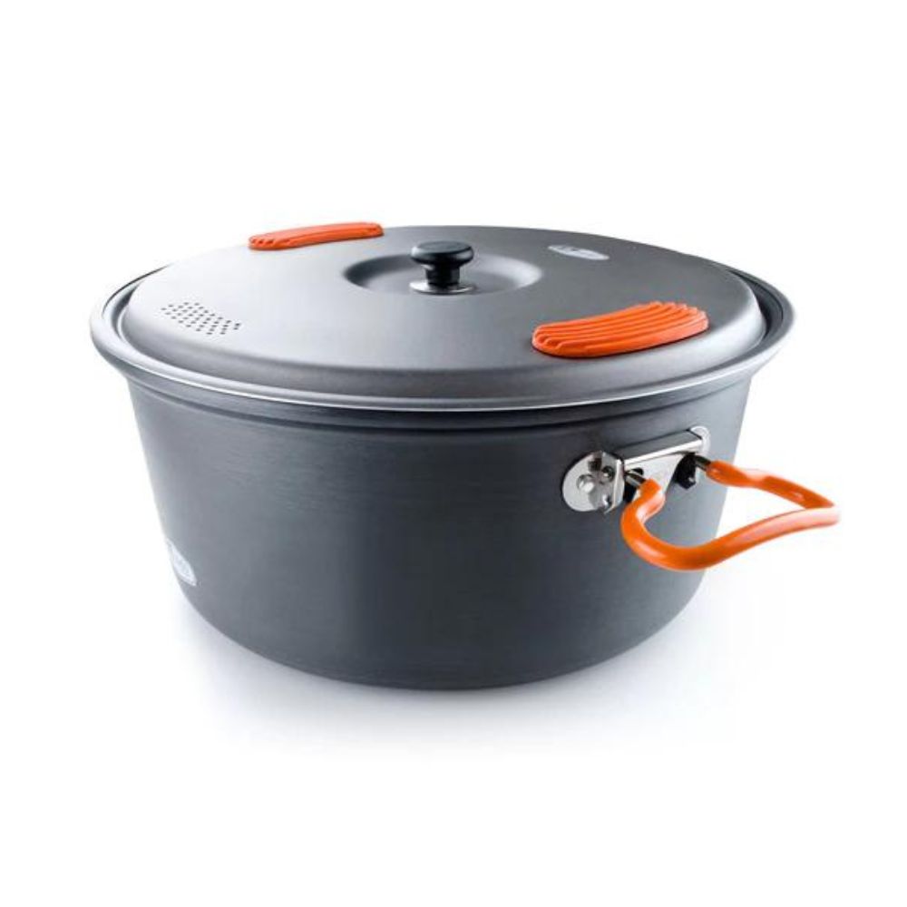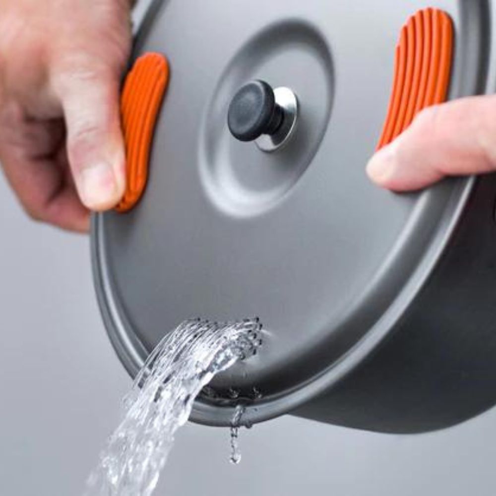 Halulite hard anodized aluminum provides superior conductivity to titanium while still being incredibly light meaning that this 4.7 liter pot cooks more efficiently so you can go farther and carry less fuel. The integrated silicone thumb pads on lid make straining pasta safe and secure.