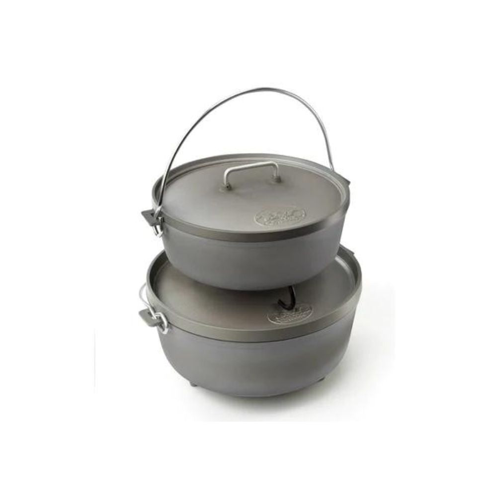 The GSI Outdoors Dutch oven comes in three sizes, ten-, twelve-, and fourteen-inch. The ten-inch has no legs allowing it to nest in the larger ovens, while two larger sizes have three fixed legs to support them over the coals.