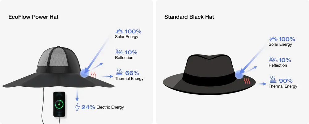 During the charging process, the brim's solar panels convert up to 24% of absorbed heat into electricity. Compared to a standard black hat, it has a lower surface temperature, providing a cooler experience.