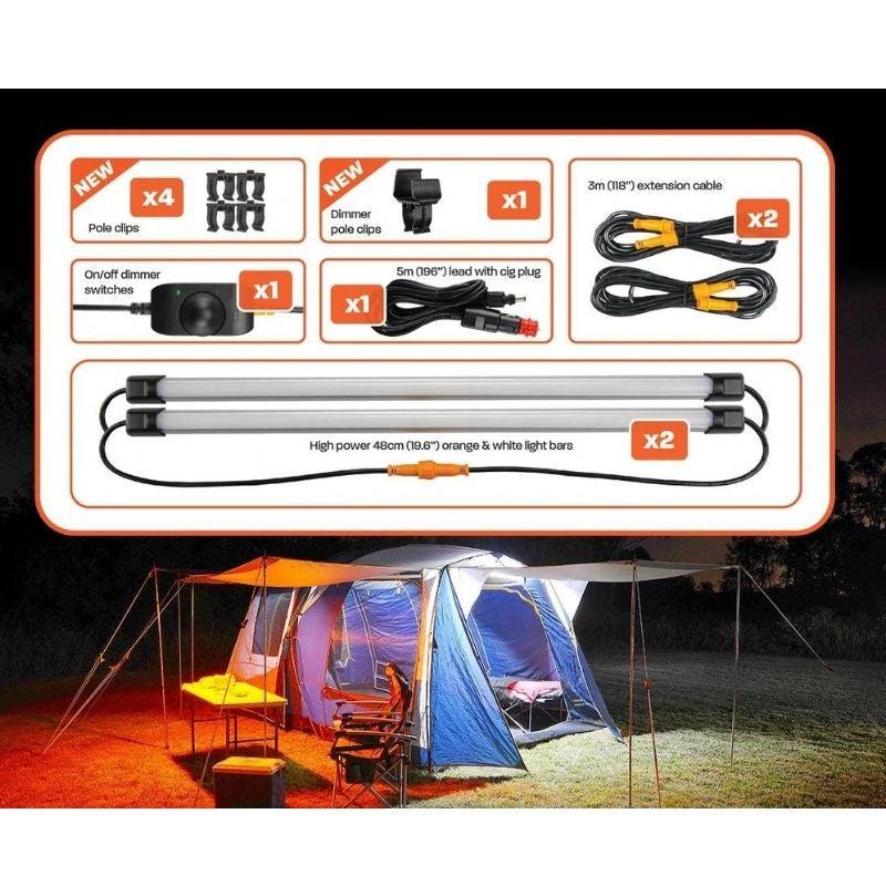 The 2 bar LED camping light kit is designed to be a perfect starter kit for those with small setups or who are just starting out with camping. It is also a popular choice for illuminating canopies or toolboxes.