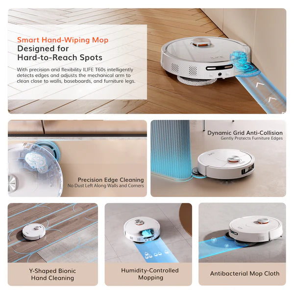 The ILIFE-T60s-WH is a white-colored, AI and LiDAR-equipped robotic vacuum and mop from ILIFE. It features a self-sufficient station that automatically washes and refills the mop, dries it with hot air, empties the dustbin, and cuts hair to prevent tangles. Key features include high suction power (up to 17,000Pa), automatic detergent dispensing, and AI Night Vision for low-light cleaning.
