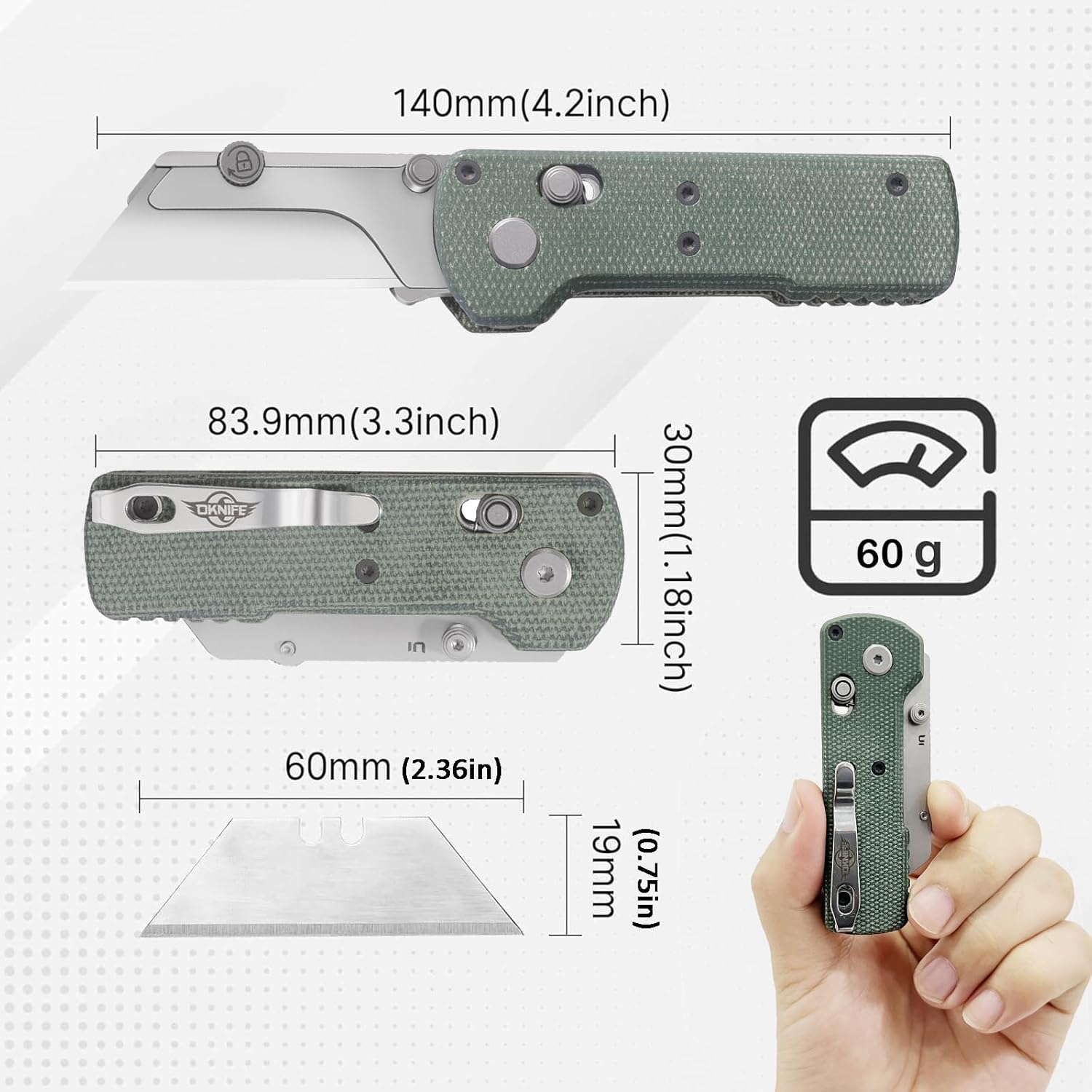 The OKNIFE U1 Green Micarta is ideal for everyday carry, weighing just 67 grams, 7 grams lighter than G10. This makes our folding utility knife a superior choice for those who value both performance and the feel of their tools. U1 utility knife is the epitome of convenience and functionality, perfect for men and women who value a lightweight and unobtrusive EDC tool