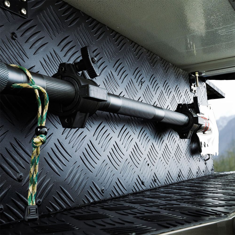 • The multi-purpose pole clamp offers versatile attachment options for various accessories, such as spotlights, work lights, televisions, shower heads, and more, to tent or awning poles. It also serves to secure tools like shovels, axes, or fishing rods to roof racks or vehicle surfaces.