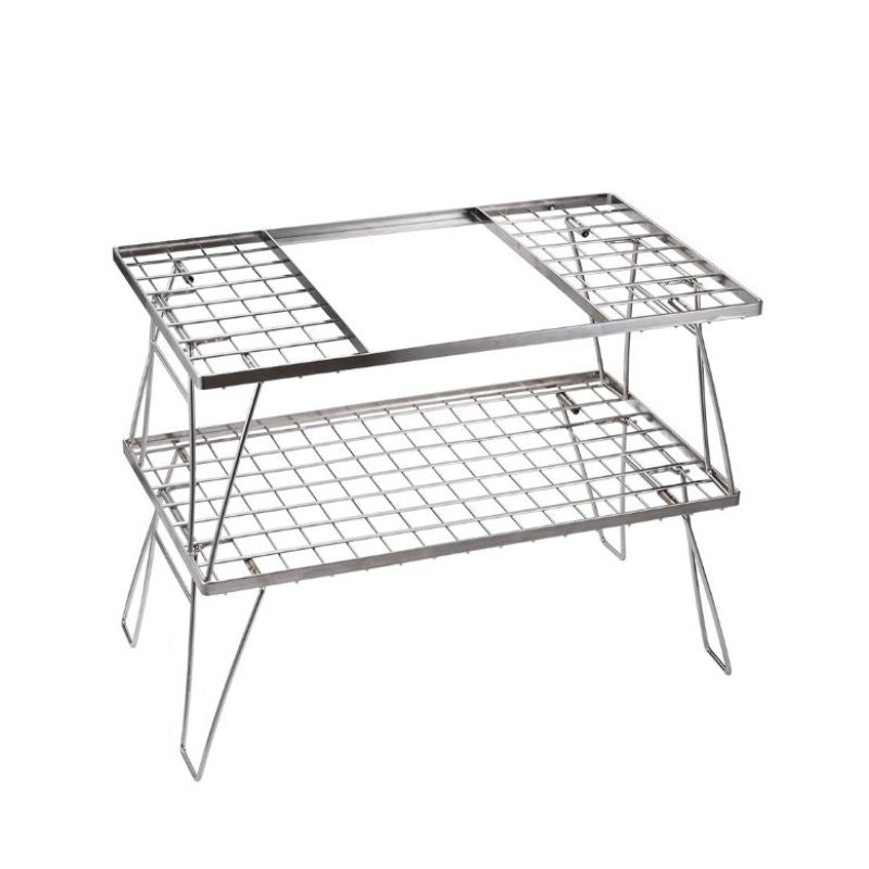 Introducing a high-quality stainless steel organizing rack that's more than just a table – it's a versatile cooking station. This foldable table includes a removable center compartment designed to accommodate a stove.