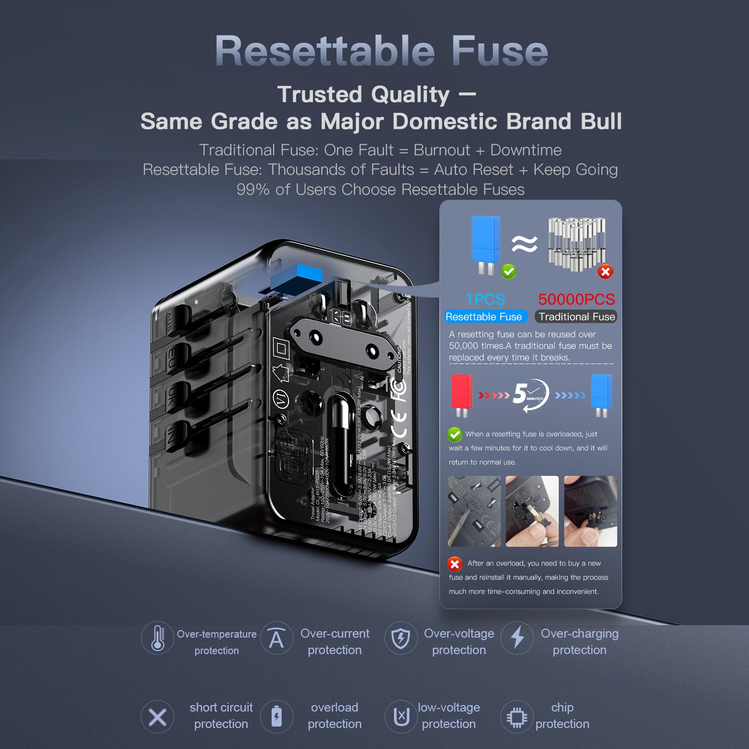 The Travelest GaN 35W Universal Travel Adapter is your all-in-one power solution on the go. It integrates 5 international plug types (US/UK/EU/AU/Asia) with additional support for India & Thailand, and powers multiple devices simultaneously via 3 USB-C and 2 USB-A ports. With 2500W AC capacity, it handles high-power appliances, and can charge a MacBook 13 to 60% in 40 minutes. A resettable fuse (50,000+ cycles), baby-proof outlet, and advanced temperature control keep charging safe and efficient during extended use.