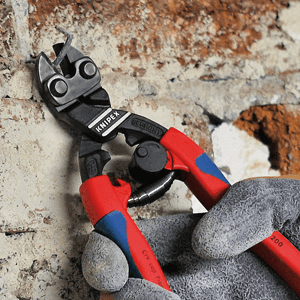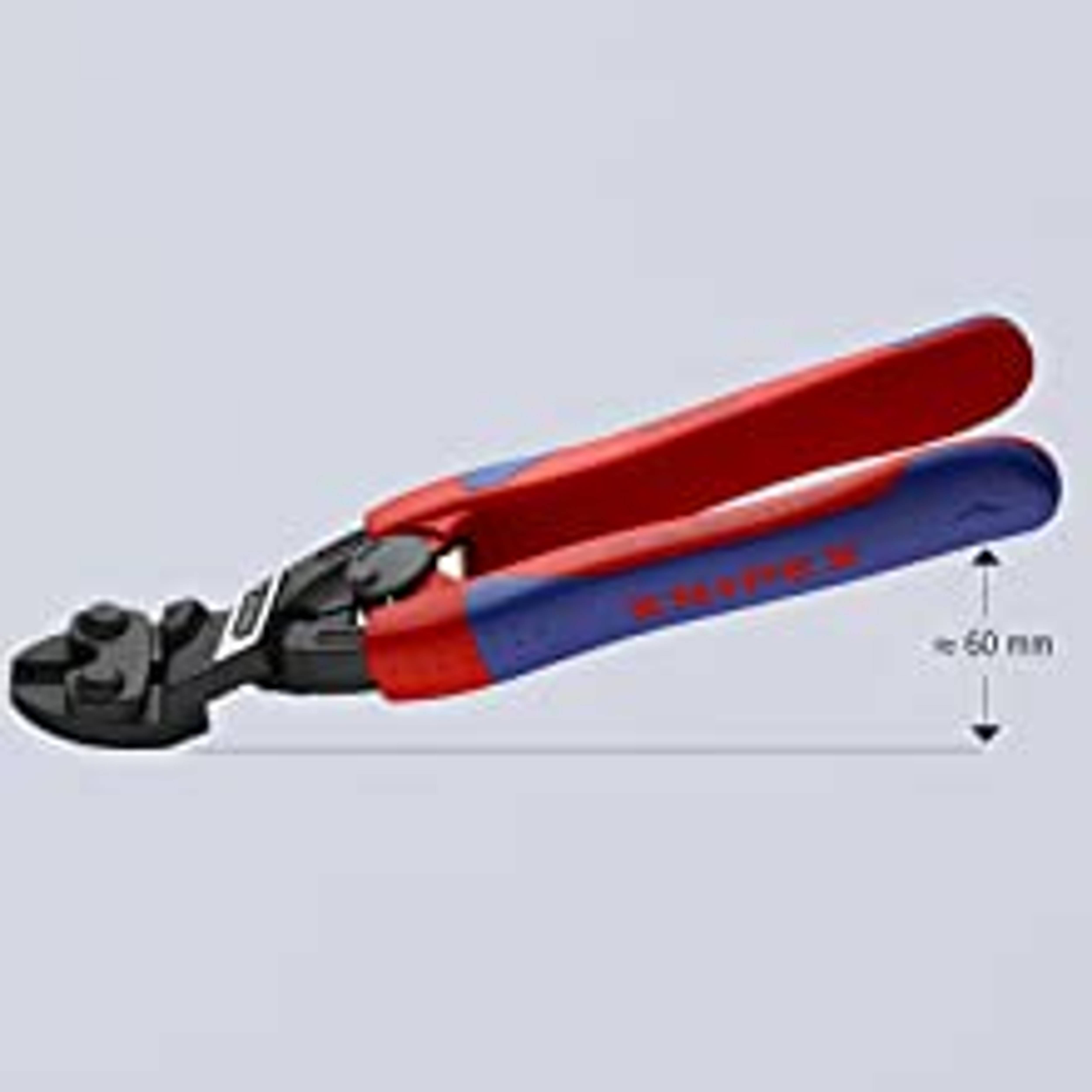 71 22 200 KNIPEX CoBolt®With precision cutting edges for soft, hard and piano wire. Cuts bolts, nails, rivets, etc. up to Ø 5.2 mm. Efficient joint design ensures exceptional cutting performance with little effort. Cutting edges additionally induction-hardened, cutting edge hardness approx. 64 HRC. with slim multi-component grips without collar for better handling and easier transport. Opening spring and locking device are integrated in the handles also for comfortable work and protected transport. 20° angled head with joint bar on one side and side cutter for almost flush cutting, with space for gripping.