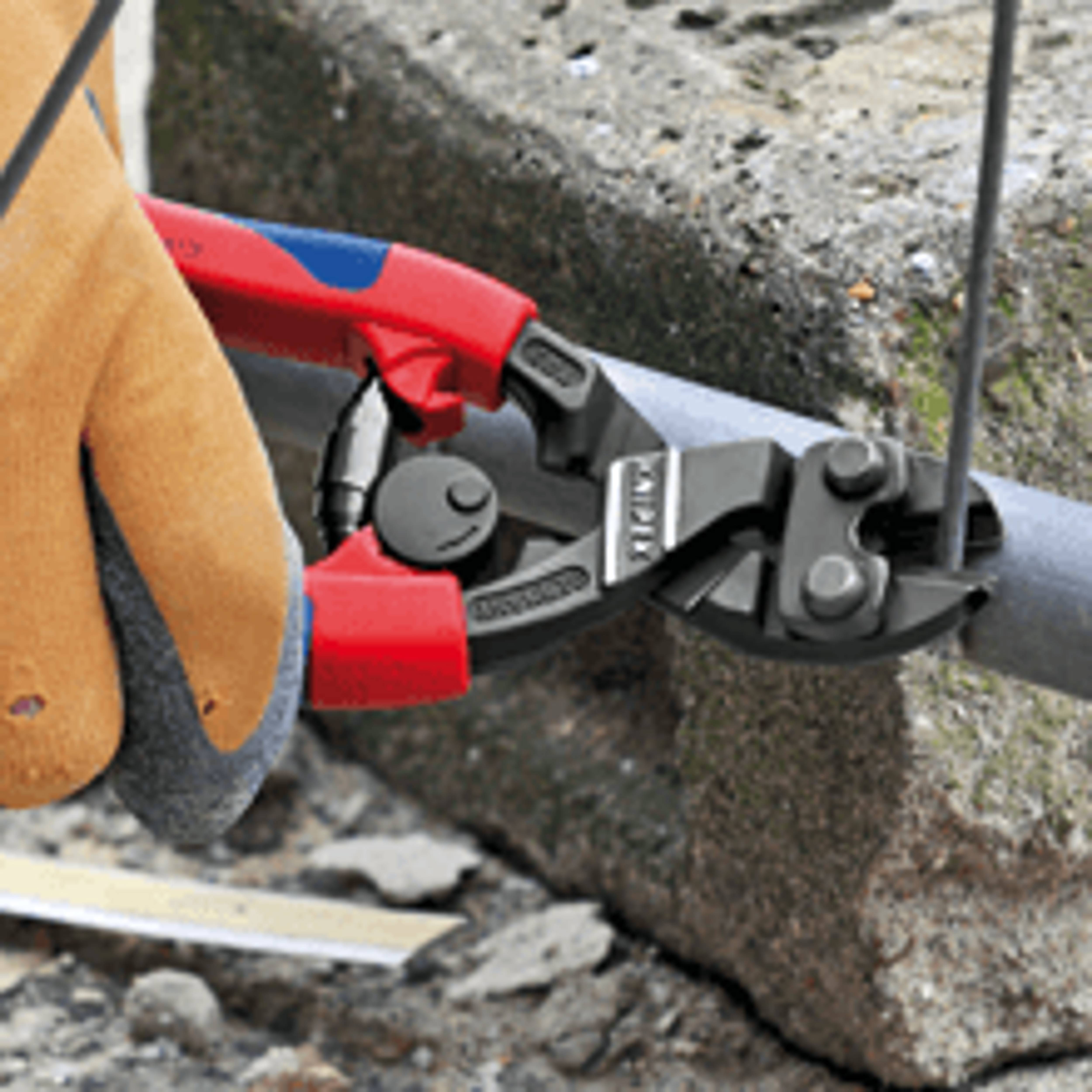 Muscle man with the clever bend The Knipex 71 22 200 CoBolt compact bolt cutters with angled shape for flush cutting. The CoBolt 71 22 200 with the 20° angled pliers head has been designed for all jobs where you need to cut as close as possible to the surface below. Protruding nails, screws, wire or strands with diameters up to 6 mm can be cut flush thanks to its sophisticated design with joint bar on one side. This means it offers enough space for gripping even in confined work situations. Small tool, big impact Those used to working with standard bolt cutters will appreciate how user-friendly the CoBolt 71 22 200 is. |