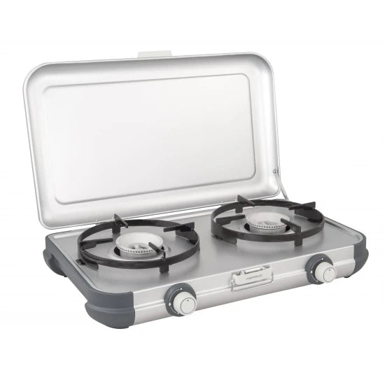 Camping Kitchen 2: Campingaz cooker (table model). Are you going away for a weekend and are you looking for a compact but solid camping stove? The Campingaz Kitchen 2 is your ideal travel partner with two burners that can be operated separately. This camping gas stove works on the Campingaz R904/R907 butane or propane cylinders.
