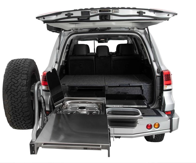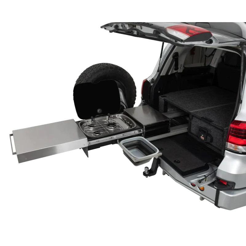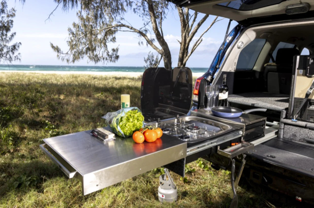 You’ve all heard the line before: “It’s got everything but the kitchen sink”. Well at ARB 4×4 Accessories, we like to consider ourselves a solutions-based business, so here it is, the fully on-board, integrated and perfectly practical ARB Slide Kitchen now to suit wagons, complete with a sink! While contained within an ARB modular drawer frame, the Slide Kitchen is not only a drawer, but a complete stainless steel slide-out kitchen with bench space, a three-burner cook top, kitchen sink and its very own utensils drawer and spice rack.