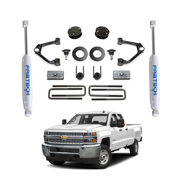 This quality Upper Control Arm system provides a 3.5″ increased ride height over stock without creating suspension bind at full droop. Lift is accomplished with spacers that utilizes the factory coilover shocks for a stock ride. The Fabtech Upper Control Arms address the geometry of the front suspension with the new ride height for proper align-ability. Heavy duty ball joints allow for extended travel to eliminate binding. Due to the GM suspension geometry there are no differential drop brackets required for the CV axles to operate properly. Rear lift comes from 1 blocks and u-bolts.