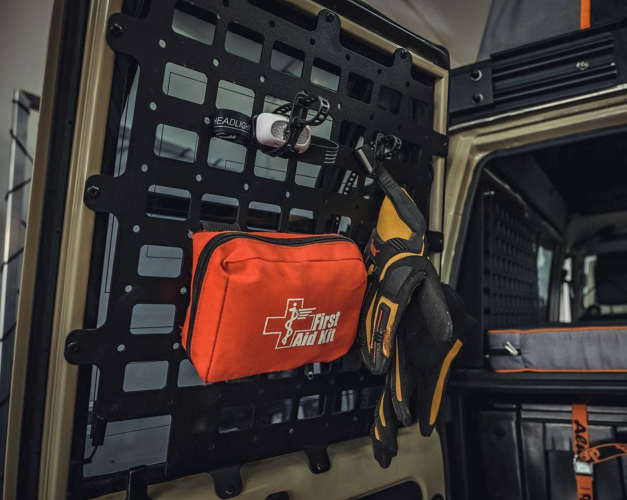 The Rear Door Molle Plate Set for the Land Cruiser 76 series, consists of a small and large plate to fit the LC76 rear doors. This is the perfect solution for the mounting of additional gear; like medical kits, recovery gear, axes, kitchen utensils, etc. – all in an easy-to-reach location.