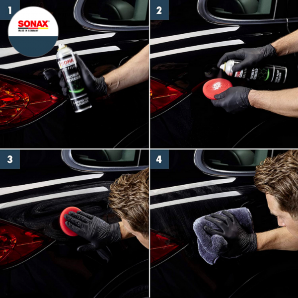 Sonax Polymer Net Shield is packaged in an aerosol can for two reasons: First, as soon as the contents are exposed to oxygen, the hybrid polymers immediately begin to cross-link and harden. Second, ease of application! Thanks to its aerosol packaging, Sonax Polymer Net Shield takes just minutes to apply. Simply spray Sonax Polymer Net Shield directly onto the surface or onto a foam applicator, spread evenly and buff off to reveal a reflective, glass-like shine.