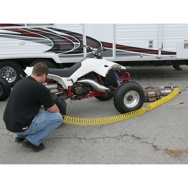 300P is a larger powerful portable tire inflator kit that is capable of inflating up to 33-inch tires easily by simply clamping the power leads to your battery, connecting the tire chuck to the valve stem and turning the unit on. Tire pressure can be checked using the 5-in-1 Inflator/Deflator inline pressure gauge.
