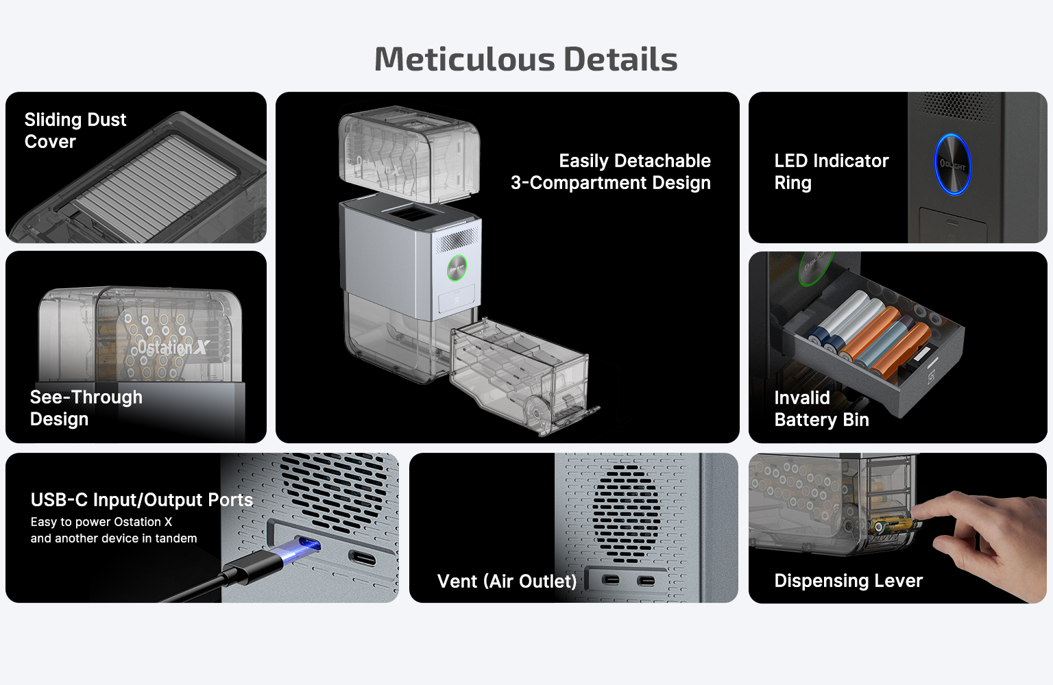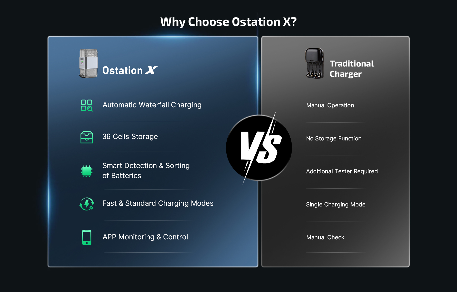 3-in-1 Automatic Rechargeable Battery Charger: Say goodbye to traditional chargers. Ostation X charges, tests, and organizes your batteries. Having undergone over 10,000 charging tests and backed by 16 patents, it’s CE, FCC, and UL certified for reliable, worry-free use.