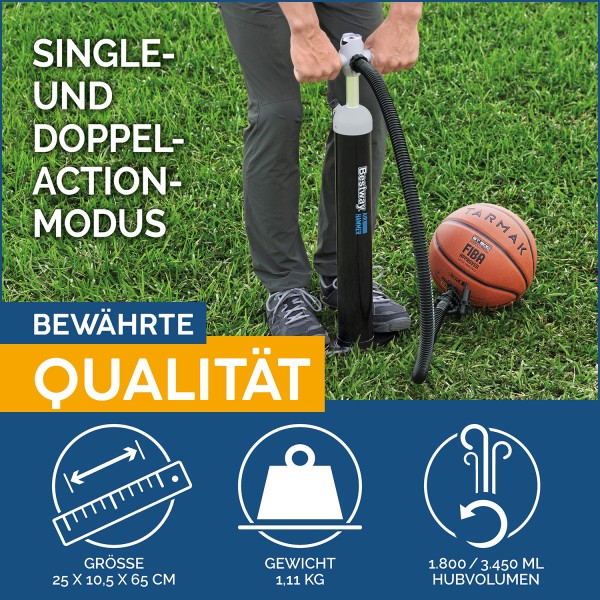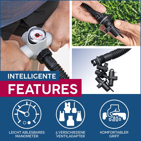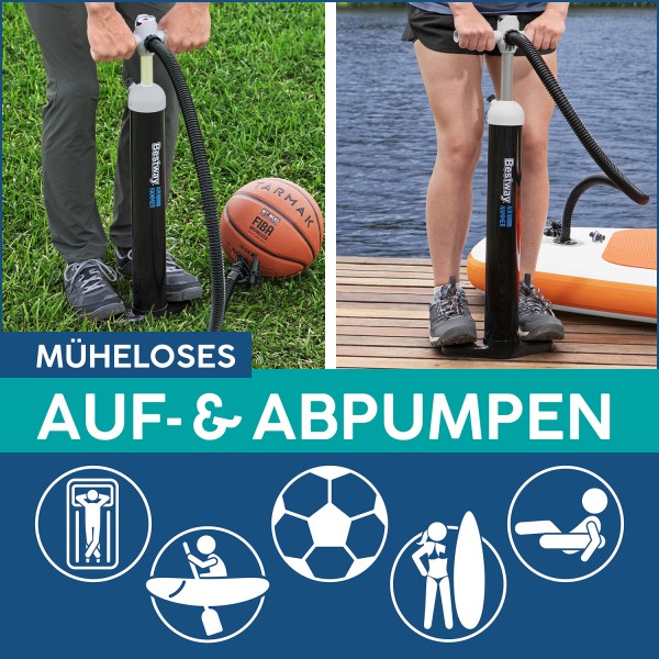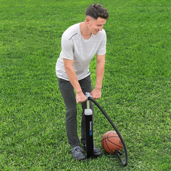 Get ready for the ultimate inflation experience with the Bestway® Air Hammer™ Sport High Pressure Pump! Measuring 25 x 10.5 x 65 cm and with a stroke volume of up to 3.45 liters per cycle (in two movements), this pump is designed for maximum air flow and to make inflating your favorite inflatable items as easy as possible. The five included valve adapters allow the pump to be used on a wide variety of inflatable items such as airbeds, air mattresses, swim rings, boats, dinghies, SUPs and more. The analog, easy-to-read pressure gauge (no batteries required) has a scale of 5-23 PSI. By switching the flexible hose, you can quickly and easily switch between double stroke (up to 7 PSI) and single stroke mode (up to 23 PSI).