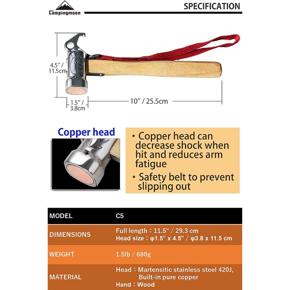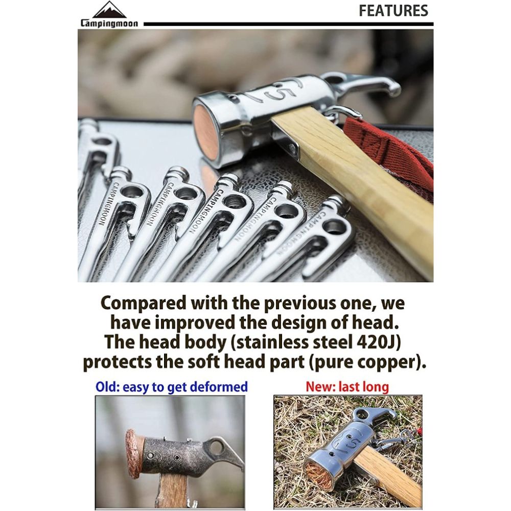- This CAMPINGMOON's camping hammer's head is high quality and uses both stainless steel 420J2 and pure copper. The internal copper hammerhead cushions the impact decreases shock when hit and reduces arm fatigue.