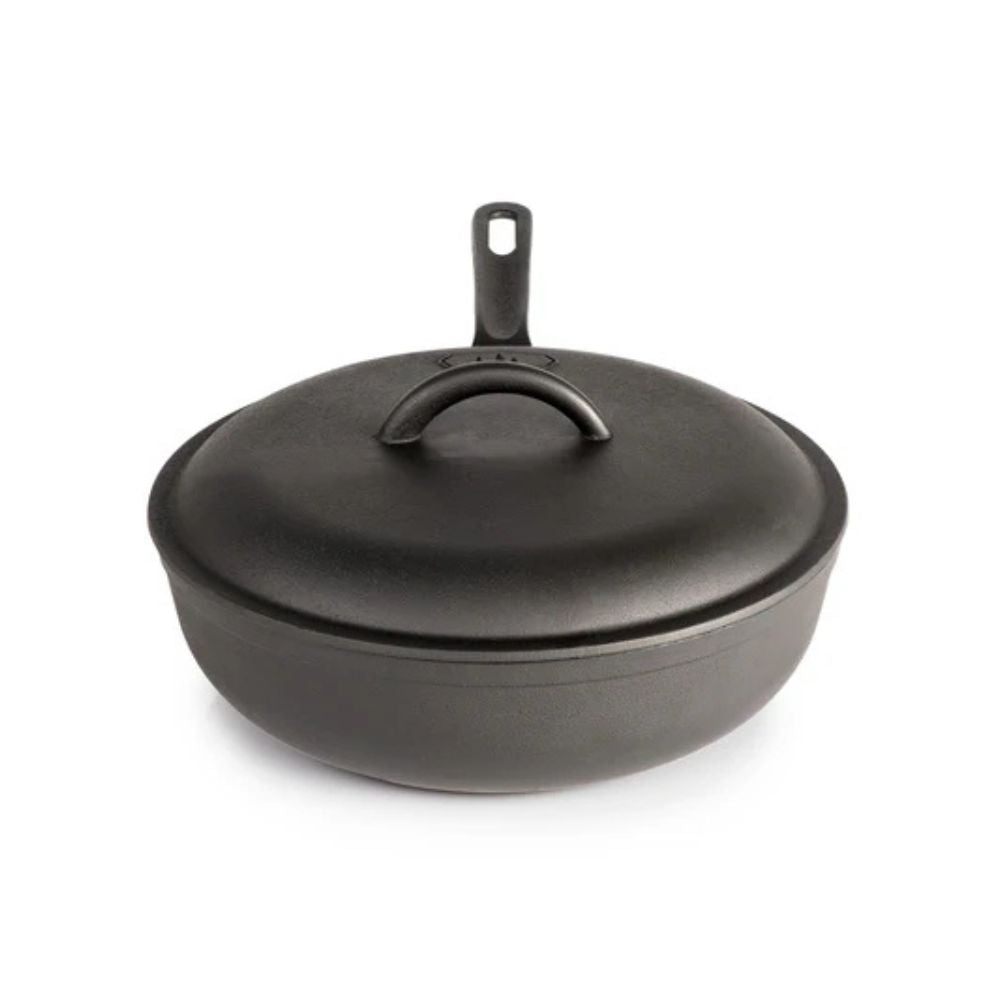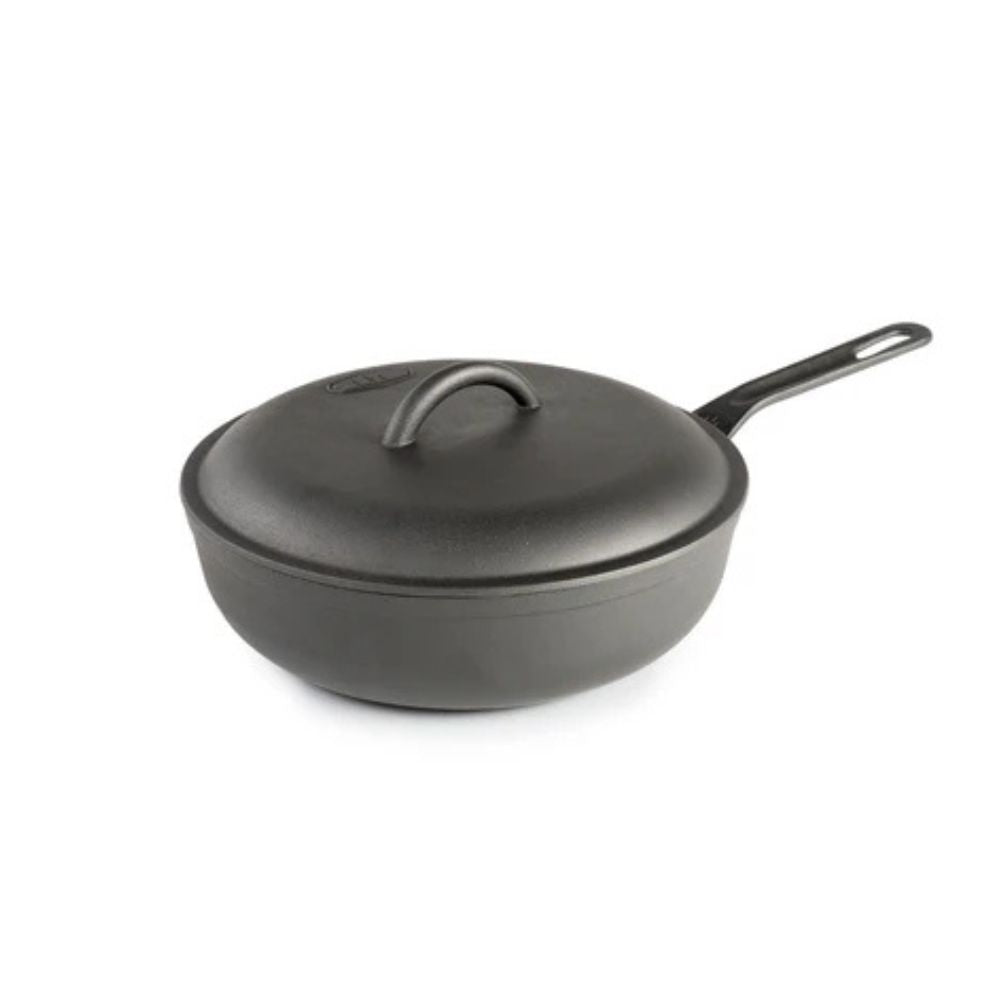 The GSI Outdoors Guidecast 12" Deep Fry Pan is a lightweight, high-performance cast iron skillet designed for campfire cooking, overlanding, and home kitchens. Featuring a nitrided surface treatment for corrosion resistance and a polished interior and exterior, this fry pan ensures even heat distribution and superior cooking performance across all cooking surfaces—including campfires, stovetops, ovens, and induction cooktops.