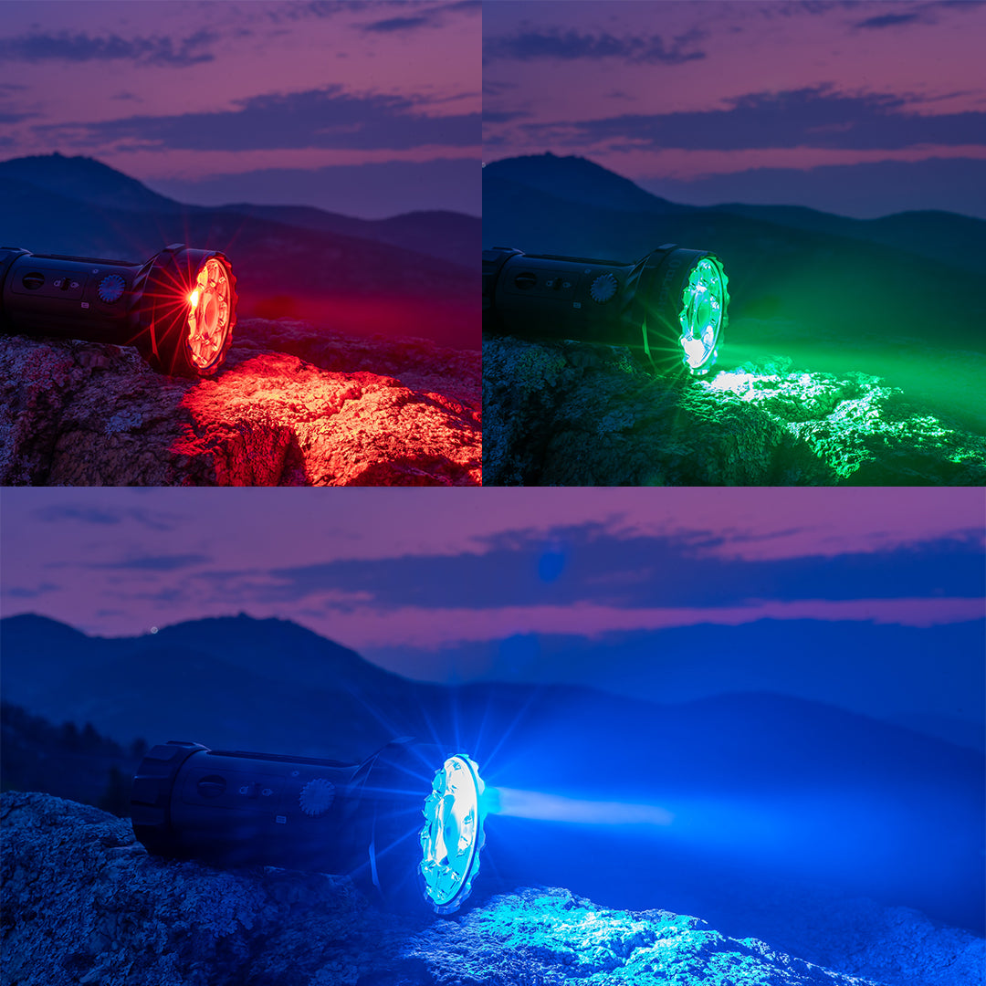 RGB Red Light Mode 3: 150~135~90~45 lumens - 100+430+10+10 minutes - 70 meters