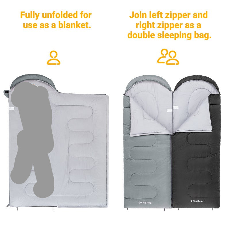 - (Interlocking & Fully Open Design) You can combine the zipper of the sleeping bag to connect it. There are two types of opening the zipper on the left and right, but you can buy it according to your personal habits. You can connect the 2 pieces to the left and right to the left and right to create a large sleeping bag for 2 people. You can also mix and match the sleeping bag with different colors. In addition, the sleeping bag can be opened and closed with double zippers on both sides and inside the sleeping bag for easy temperature adjustment. It can be fully opened from the feet to the shoulders, and can be used as a futon, comforter, leisure sheet, etc