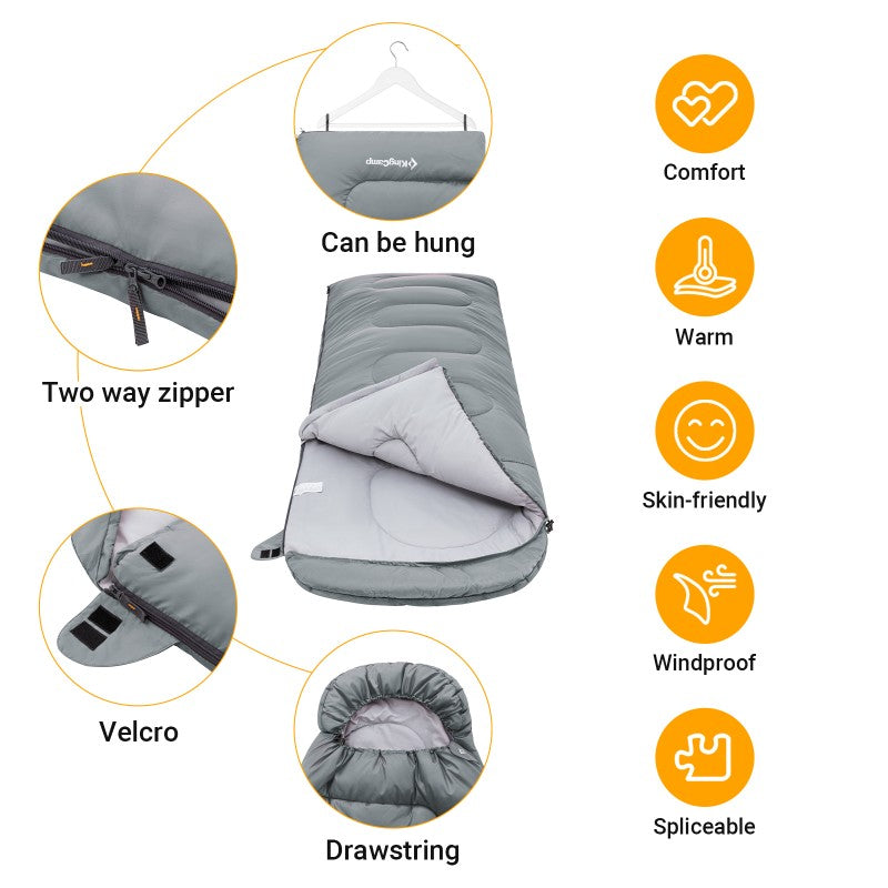 - (Suitable for All Season & Wide Size) Comfortable Temperature: 44°F - 15.4°F (2°C - 7°C); Extreme Temperature: -4°F (-13°C). Suitable for all seasons. The zipper of the sleeping bag has a pinch prevention cloth to prevent the fabric from getting in. The wide size sleeping bag is more freely to put in and out of the sleeping bag compared to other sleeping bags. The envelope style is the same size from neck to foot, allowing for easy temperature regulation, no pressure feeling and a comfortable sleep like a duvet