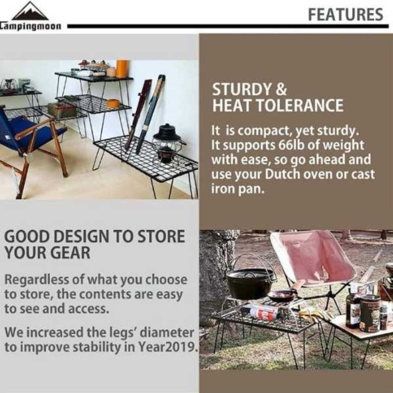 You can get your camping gear organized by using this storage rack. You can put your camping gear like cooking ware, packs, totes, bins, cooler, water container box, etc… on it, also ok for hot things such as pots or Dutch oven, hot pots or stove etc…on this rack directly.