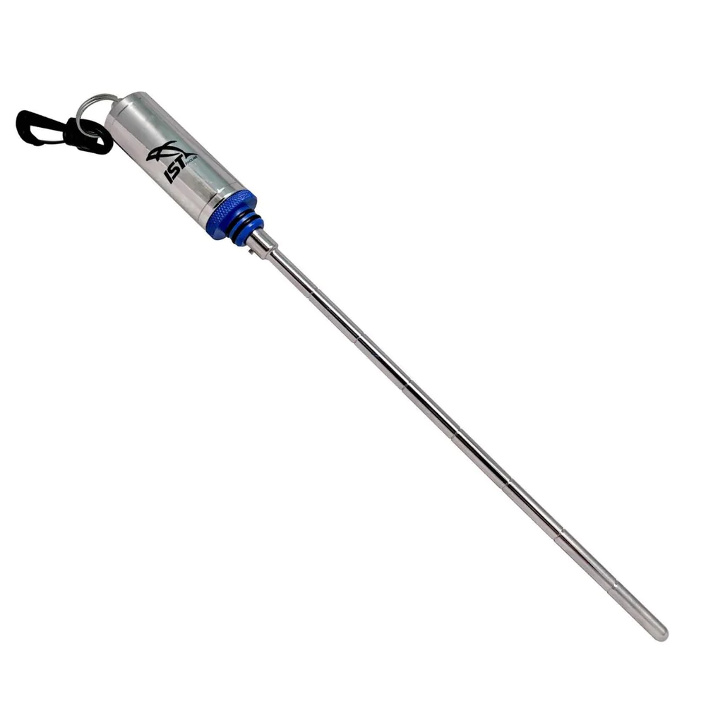 Compact stainless steel underwater shaker with measure rod.