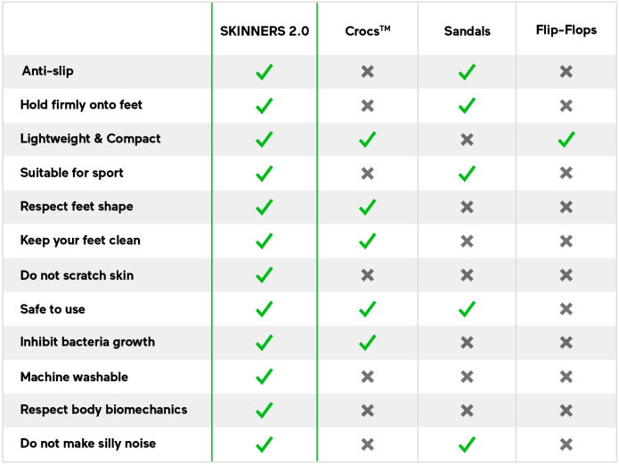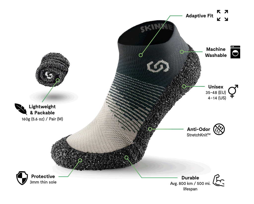 - Fitness: Socks, flip-flops, running shoes. Skinners disrupt this trinity of gym footwear and combine the advantages of each – the freedom of a sock, the great grip, and the basic protection of shoes.