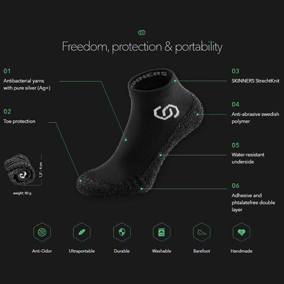 • Fitness: Socks, flip-flops, running shoes. Skinners disrupt this trinity of gym footwear and combine the advantages of each – the freedom of a sock, the great grip and the basic protection of shoes.