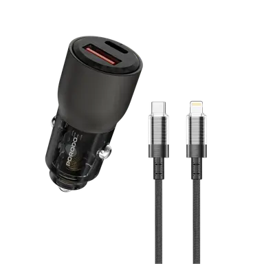 Get the fast and perfect charging experience you aspire to while driving your car by choosing the Porodo Transparent USB-A+C Port Car Charger with C To L Cable, which features a very distinctive design that is easy to store and use, along with two different charging ports and a built-in Type-C charging cable.