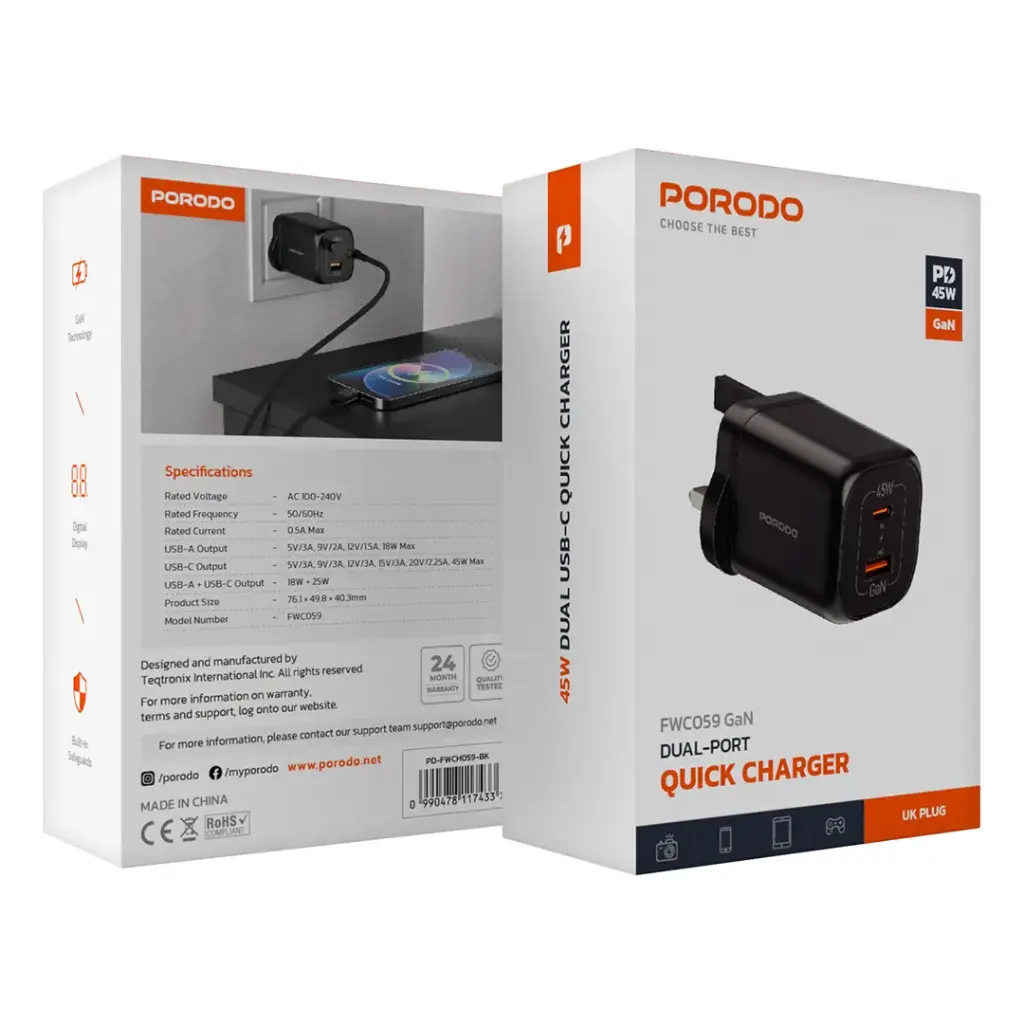 The Porodo dual port quick charger is exactly what you need when fighting between the cords, a great performance charging solution for all your power needs. The GaN technology provides high-efficiency compactness with two versatile charging ports. The USB-A output is for 5V/3A, 9V/2A, and 12V/1.5A, rating maximum output up to 18W, perfect for quickly charging your devices. USB-C output provides 5V/3A, 9V/3A, 12V/3A, 15V/3A, and 20V/2.25A and has a 45W max output that lets you power your laptops, tablets, and smartphones at speed. Such a very useful device to charge two devices simultaneously. The rated voltages of the charger, therefore, can operate on AC 110-240V, rated that works with a 0.5A max current, with a UK plug for easy use. The built-in safeguards offer protection against overcharging, overheating, and short-circuiting; thus, it is safe and reliable.
