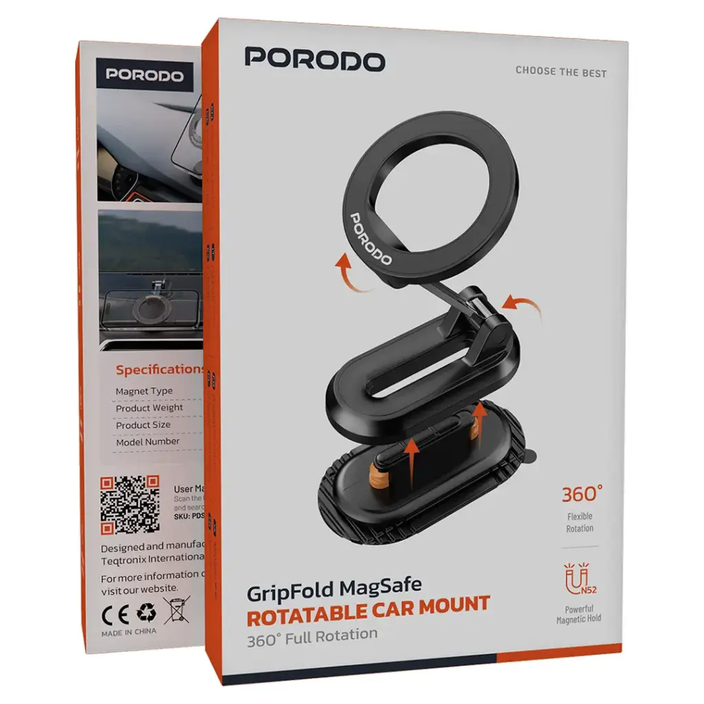 The Porodo GripFold MagSafe Rotatable Car Mount is targeting a car mounting solution for phones that is on the secure yet convenient side. The 360° full rotation feature has high versatility in mounting the phone horizontally and vertically so that the car owner can choose the exact viewing angle needed for navigation, music, or calls. Strong N52 magnets keep the phone firmly held in place so that no unwanted movement takes place while driving or on rough roads. Plus, the mount seamlessly adapts to effortless one-hand operations to click in and out of your phone with ease. Being adjustable in the viewing angle allows one to find the most relaxed view setting for them while concentrating on the traffic. Compact and sturdy for the dashboard or windshield, the setup remains consistently steady and secure for any driver.