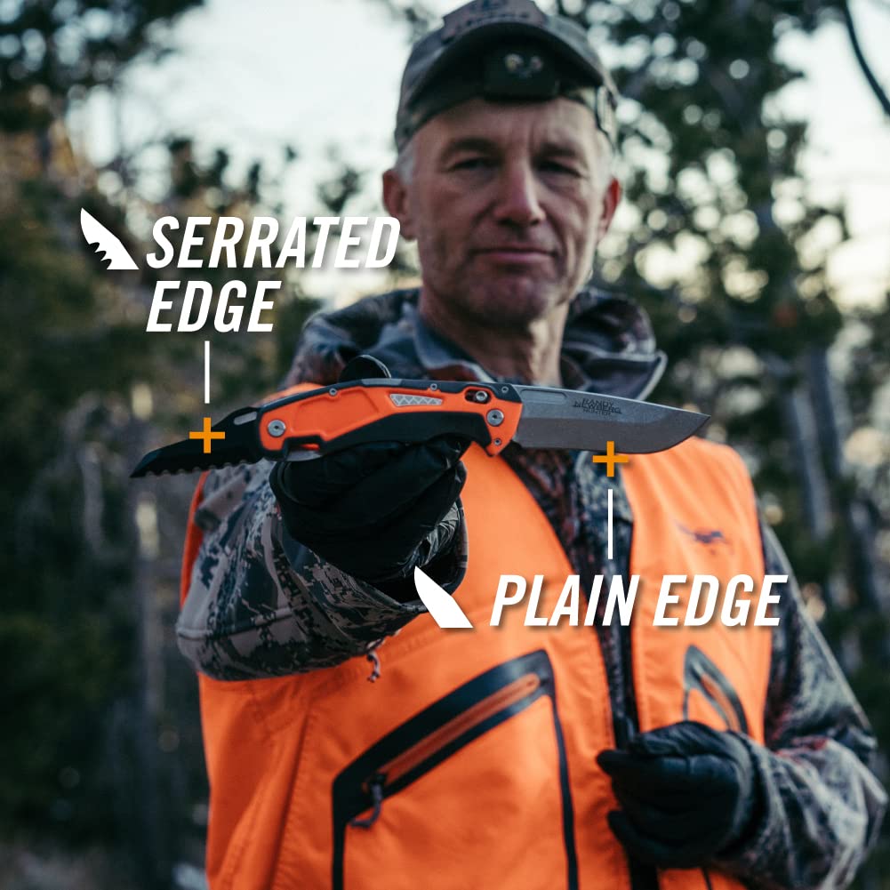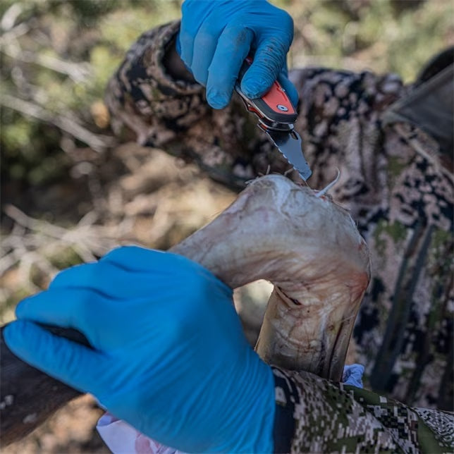 RANDY NEWBERG HAS BEEN HARVESTING MORE ANIMALS THAN YOU FOR A LONG TIME. ALONG THE WAY, HE HAS LEARNED A PLETHORA OF PRICELESS INFORMATION ON HOW TO GET THE JOB DONE BETTER. WHETHER USING THE GUTLESS METHOD OR A TRADITIONAL OPEN CAVITY METHOD, THE DTS IS MORE THAN CAPABLE OF WORKING THROUGH MULTIPLE ELK WITH ITS CLEVER TENDON TOOL, PRESERVING THE LIFE OF THE PRIMARY BLADE. CUTTING THOSE TOUGH-TO-GET-TO TENDONS AND SWEDGING THE ATLAS JOINT APART WILL NO LONGER BE THE DEMISE OF YOUR KNIFE