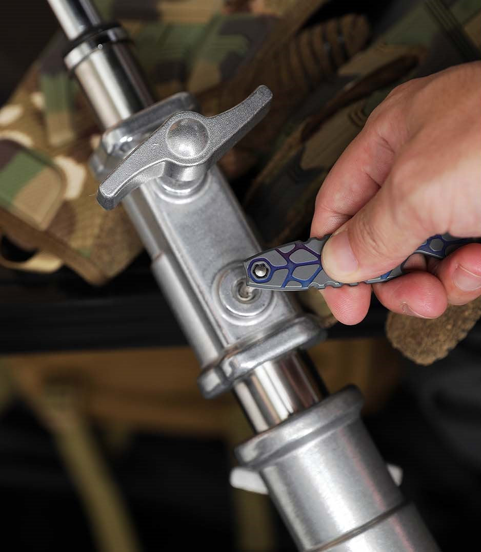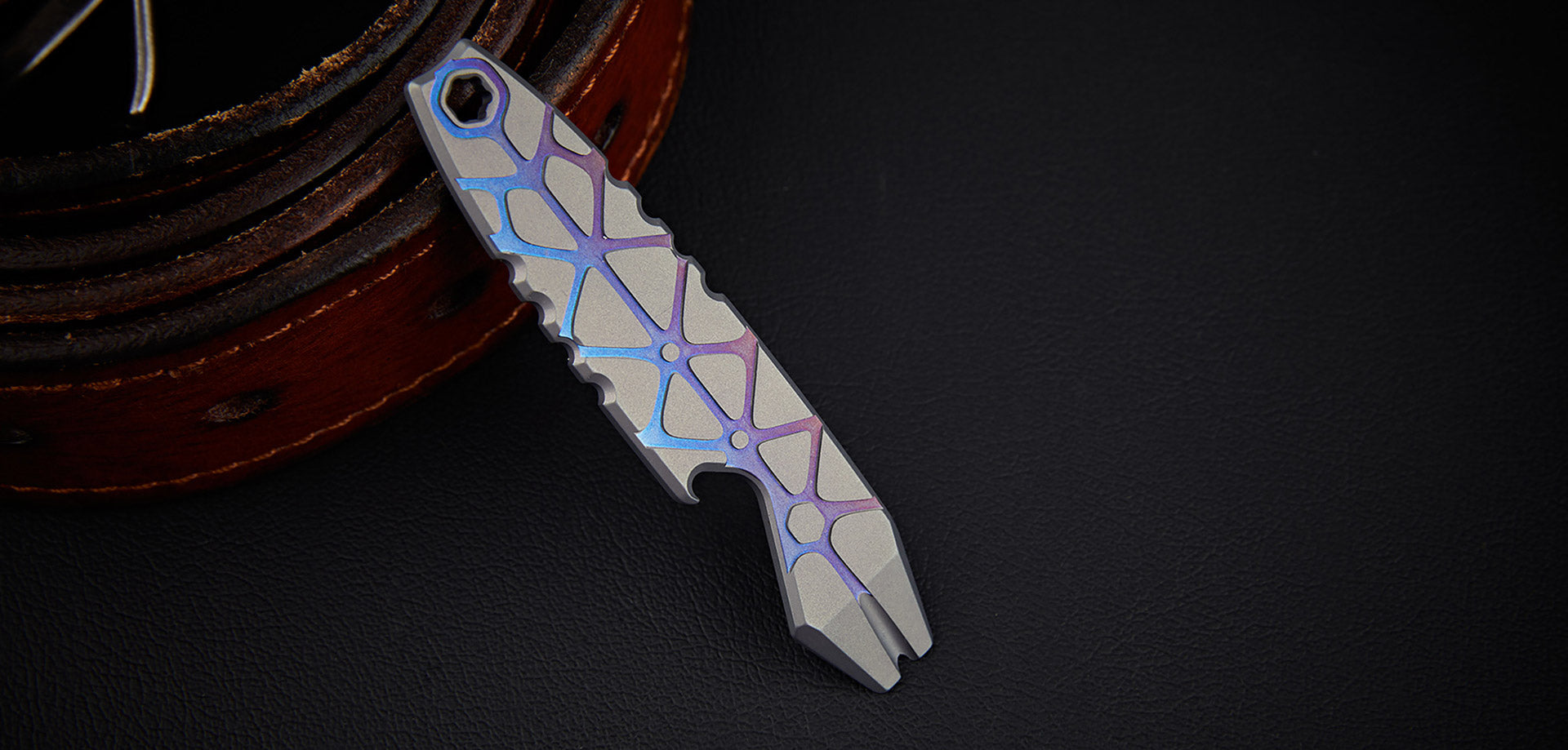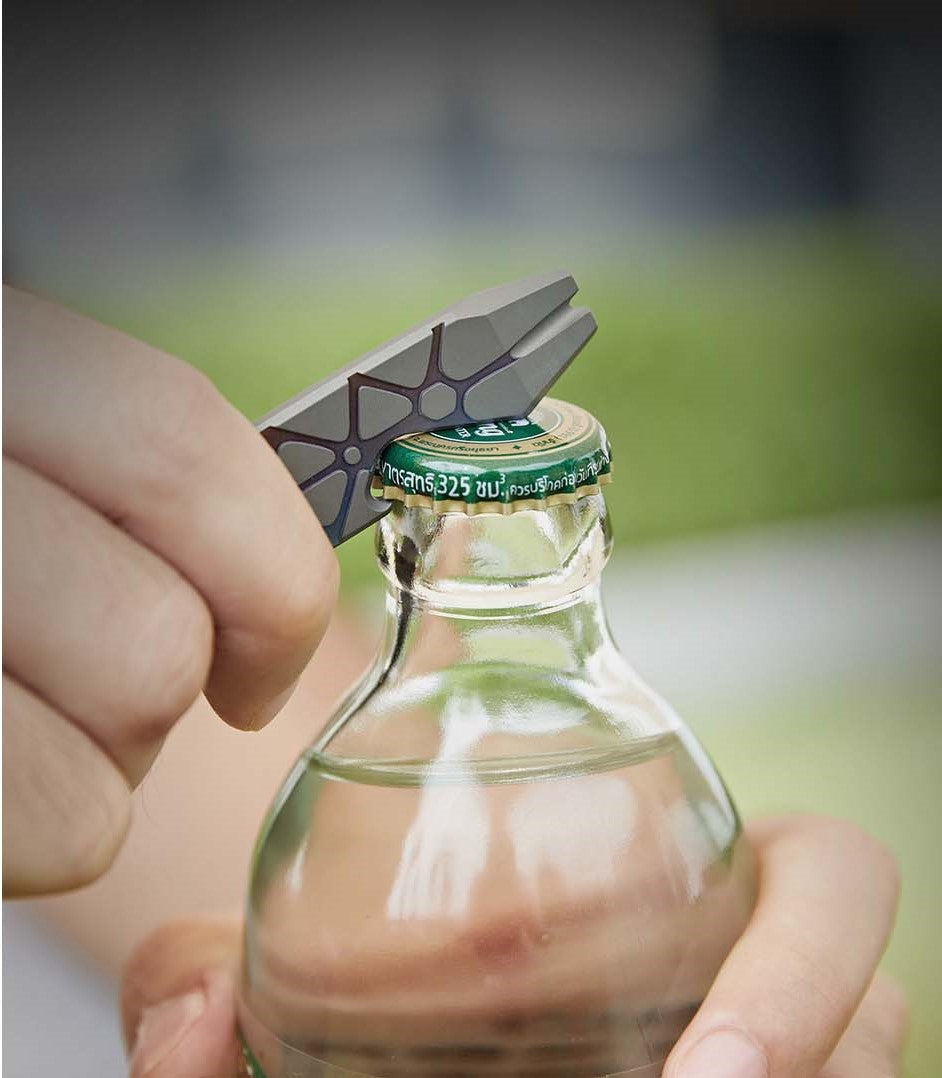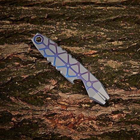 Serve as a pry bar, a bottle opener, a metric ruler, and 5 hex wrenches (5 mm, 6 mm, 6.35 mm, 8 mm, 10 mm). Made of Titanium with high strength and excellent corrosion resistance. Stonewashed body, accented with a copper inlay and glossy blue hardware. The large and tight titanium pocket clip secures it in your pocket or backpack. The hex slot at the top doubles as a lanyard hole or keyring.
