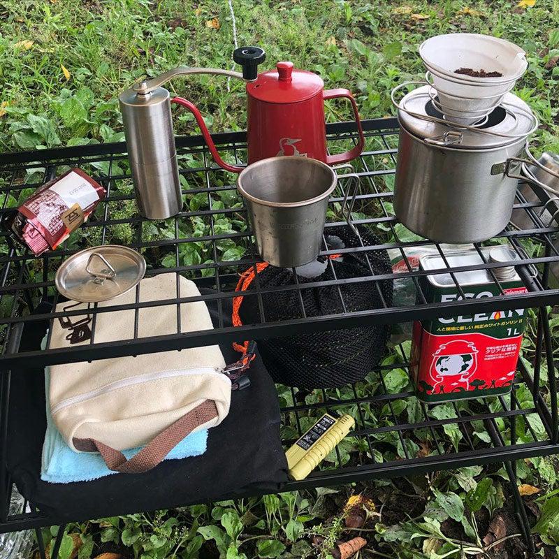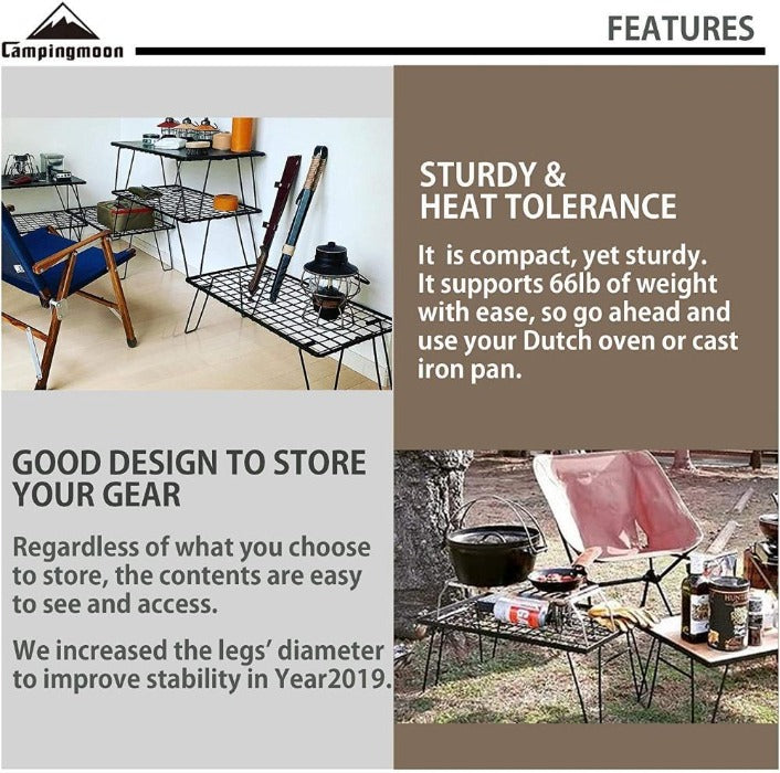 Introducing high-quality steel foldable tables designed to keep your camping gear organized. These versatile storage racks are perfect for storing camping equipment such as cookware, packs, totes, bins, coolers, water containers, and more. They are also suitable for holding hot items like pots, Dutch ovens, and stoves directly.