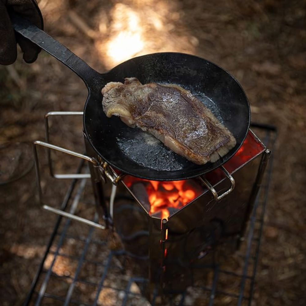 - Attached trivet for using as a kettle stand or pot stand on top of the charcoal chimney starter, making it usable as a charcoal camping stove.