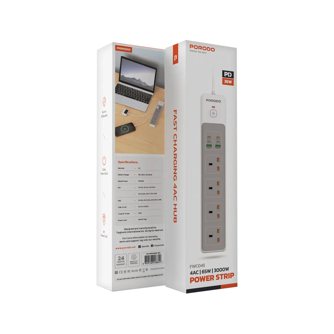 The Porodo 4AC 65W 3000W Power Strip is one of the best power solutions available today for homes and offices. Built with quality PC material for durability and safety. The rated voltage is 110 to 265V, and the maximum reach is 3000W, including multiple device support. Supports PD fast charging up to 35W with USB-A and USB-C ports, totaling up to 65W DC output in seamless power delivery. The extra 3 meters for reach comes with the UK-plugged power cord. Built-in safety guards with a safety power switch ensure added protection. This portable power distribution unit is ideal for fast and safe charging. It is an everyday must-have accessory for anyone who regularly needs access to power.