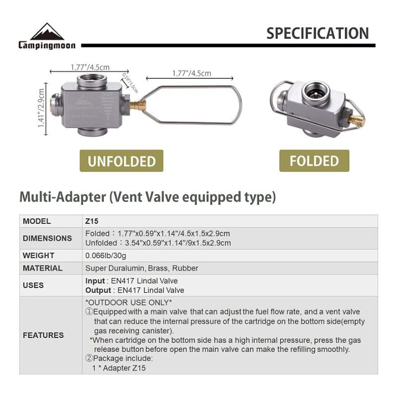 This isobutane canister refill adapter Z15 is equipped with the main valve that can adjust the fuel flow rate and a vent valve that can reduce the internal pressure of the cartridge on the bottom side(empty gas receiving canister).